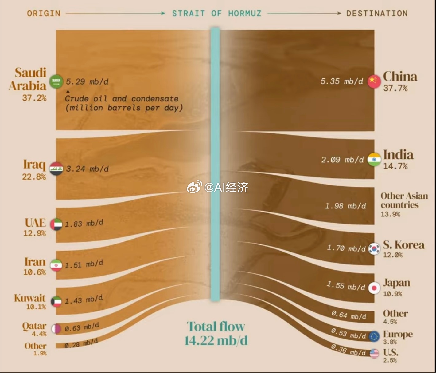 霍尔木兹封锁日本最先扛不住了海峡出口去向:目的地 Top 5(基于 2025 Q1-Q4 均值)霍尔木兹海峡流通量的 89.2% 目的地为亚洲。二、 国家依赖度比例:石油量占该国进口及消耗比该维度衡量各国对该咽喉要道的生存依赖。