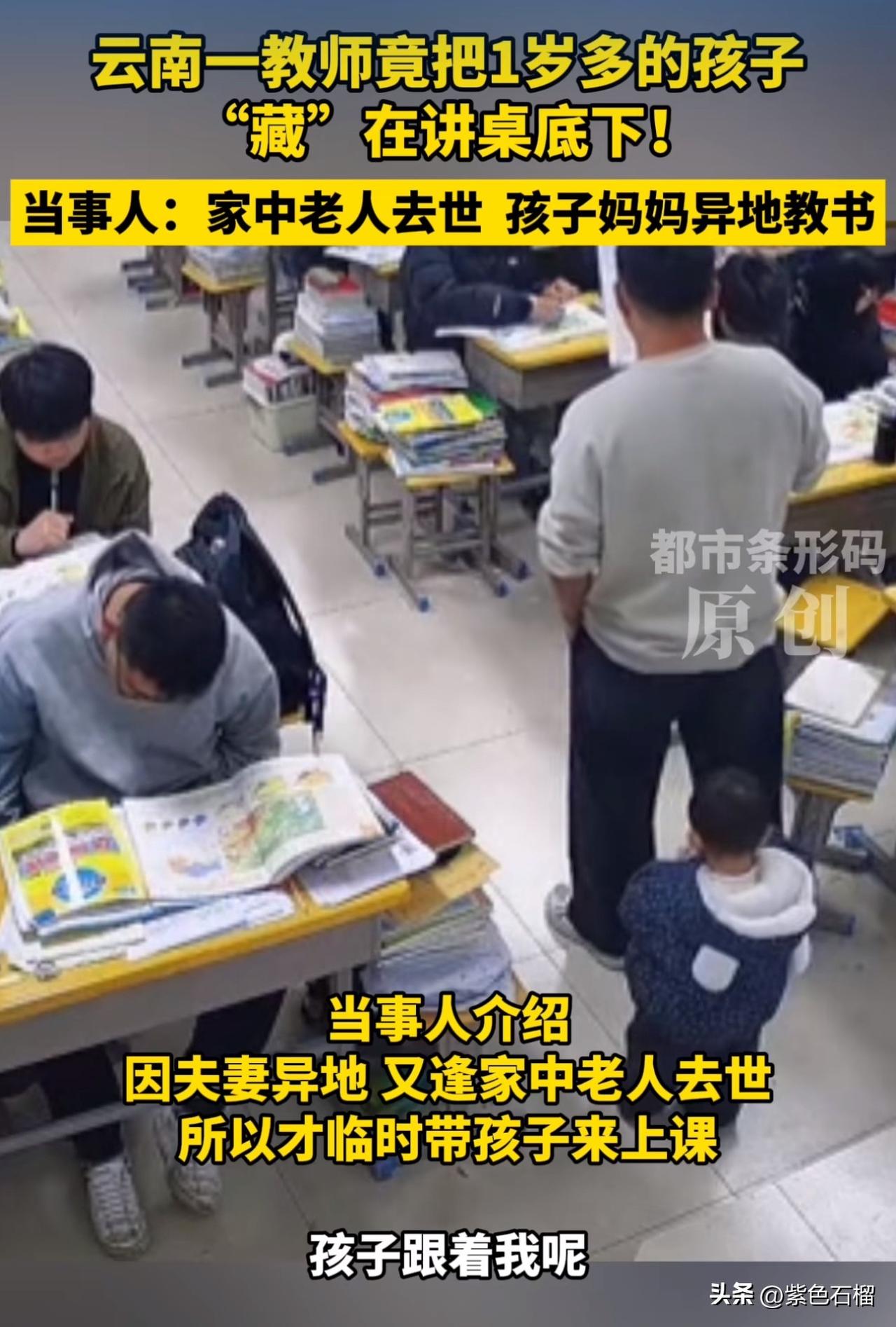 近日,云南昭通一所中学教室中,老师带娃上班的视频引发了网友热议。 视频里,孩子看上去一岁左右。这名男教师时而将孩子背在肩上,时而把孩子放在讲桌下,时而又让孩子在自己身旁玩耍。 当事人訾老师称,因家里突发变故(孩子的奶奶突然去世),妻子也是老师,孩子妈妈因工作原因无法带孩子上班,他只能把孩子带在身边。他表示,孩子很乖,上课不会发出怪异声音,孩子困了他就会把孩子背在身上。 对于此事,学校领导表示理解,还为訾老师减少了排课量,方便他照顾孩子。訾老师表示,这种情况是短期的,过段时间会把孩子交给外公外婆带。 对此,网友们看法不一。 有网友说:“他既没丢下自己的孩子,也没丢下别人的孩子,是个尽责的好父亲、好老师。” 还有网友说:“支持,单位需要这样的人性化管理,这体现了当地教育部门是有温度的单位,暖心之举值得传承。” 当然,也有网友持不同意见:“多少有点影响吧,要是能有更妥当的安排就好了。” 大家认为教师带娃上课合适吗?会影响课堂教学吗?欢迎在评论区发表您的观点。 (图片来源网络)