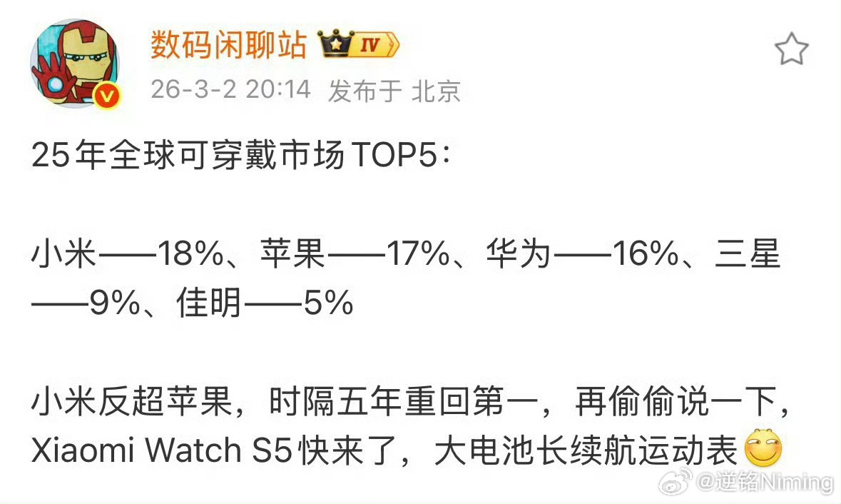 小米可穿戴重返第一,但主要还是手环比较强势,手表这块,还是任重道远,希望这次的s5能成为一个好的开始