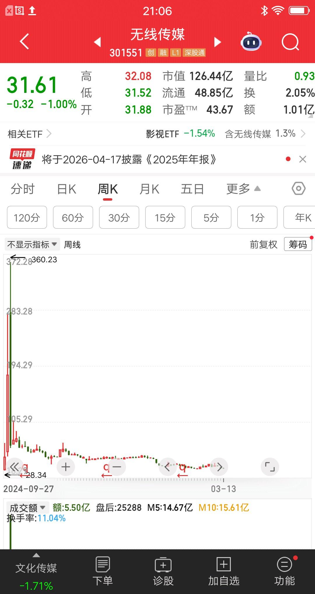 提升炒股水平最快的方式,就是多看那些跌幅很猛的票。比如你想知道,新股上市后的表现,就把这些票找出来逐个看。 无线传媒,上市第四天股价涨到最高360.23元,涨幅约12倍。刚上市的时候,炒作的热情是最高的,然后情绪慢慢褪去,股价也开始阴跌之路。现在股价31.61元,较最高点跌没了九成。大家别觉得不可思议,这在A股很常见,而且这才是该票的真实价值。 作为散户,不需要深入研究,为啥跌这么多。只需要多看,然后找到规律,避开坑就可以了。 所以对大幅上涨过的票,别去高位接盘,更不要一直加仓。不然会越套越深,越亏越多。最后彻底躺平,变成耐心资本了。