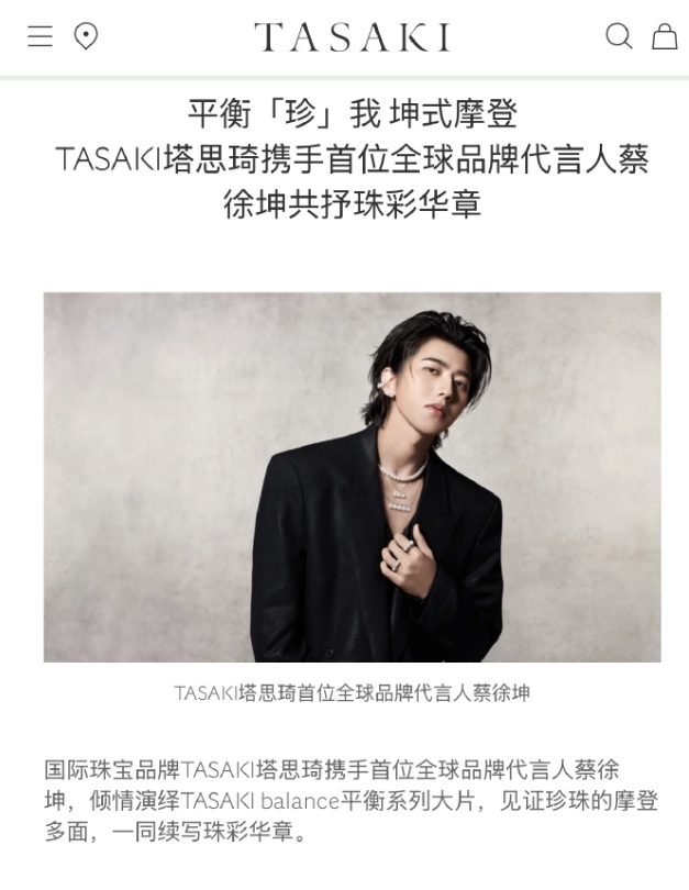 蔡徐坤空降塔思琦全球代言人!塔思琦和蔡徐坤近五年毫无合作,这次直接给了首位全球代言人的身份,压了任嘉伦的品牌代言人,日本高端珠宝品牌塔思琦创立70年以来,将首位全球代言人的身份给了中国艺人,蔡徐坤在时尚圈的影响力依旧是国际顶尖的。