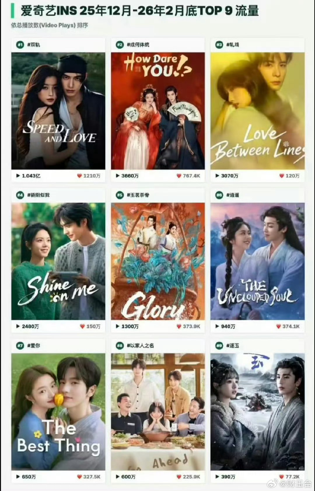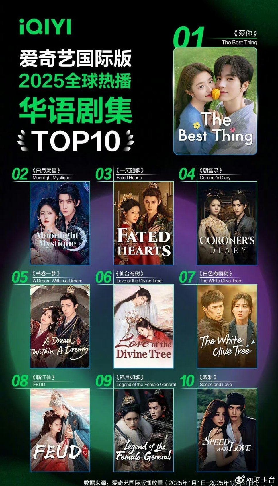 爱奇艺海外播放量前十作品这份榜单太能打了!都市、仙侠、古偶、军旅全覆盖,自制剧占比超九成,华语内容真正做到出海破圈。《爱你》以中医文化+现代爱情登顶,《白月梵星》《临江仙》双剧霸榜,东方美学与反套路剧情双向发力,多国热播榜刷屏。从传统文化现代表达,到多元题材精准破圈,不只是播放量的胜利,更是华流影响力的全面崛起。好故事无国界,期待更多国剧走向世界舞台!