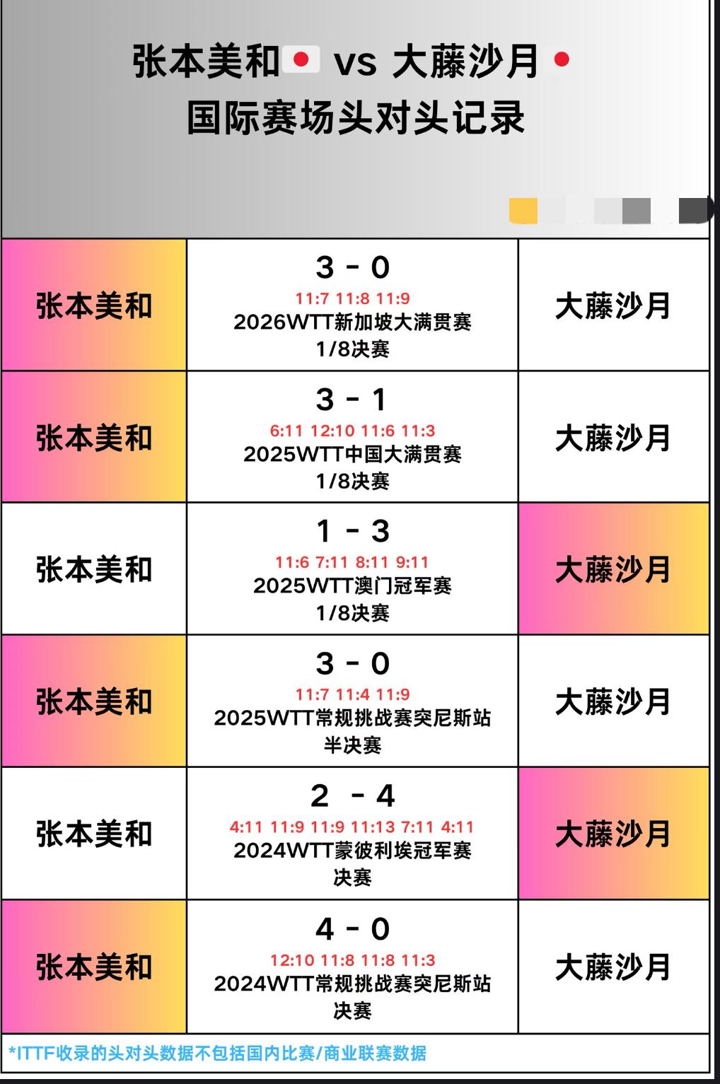 张本美和与大藤沙月的头对头全记录——重庆冠军赛女单半决赛对阵 张本美和VS大藤沙月! 从两个人的交手记录来看, 张本美和保持对大藤沙月 4胜2负的优势战绩, 两个人最后一次交手是在今年的新加坡大满贯1/8决赛中, 当时张本美和3:0大藤沙月, 但大藤沙月明显涨球了, 结果难以预料! 重庆冠军赛,女单决赛注定是 国乒对日乒, 蒯曼对大藤5次交手全胜, 蒯曼对张本美和是3胜1负, 王艺迪对张本美和是4胜2负, 大迪与大藤没有交手记录, 蒯曼,大迪不管谁进决赛, 都是打美和的概率高, 因为大藤肩膀受伤, 美和会使劲打她的正手位!