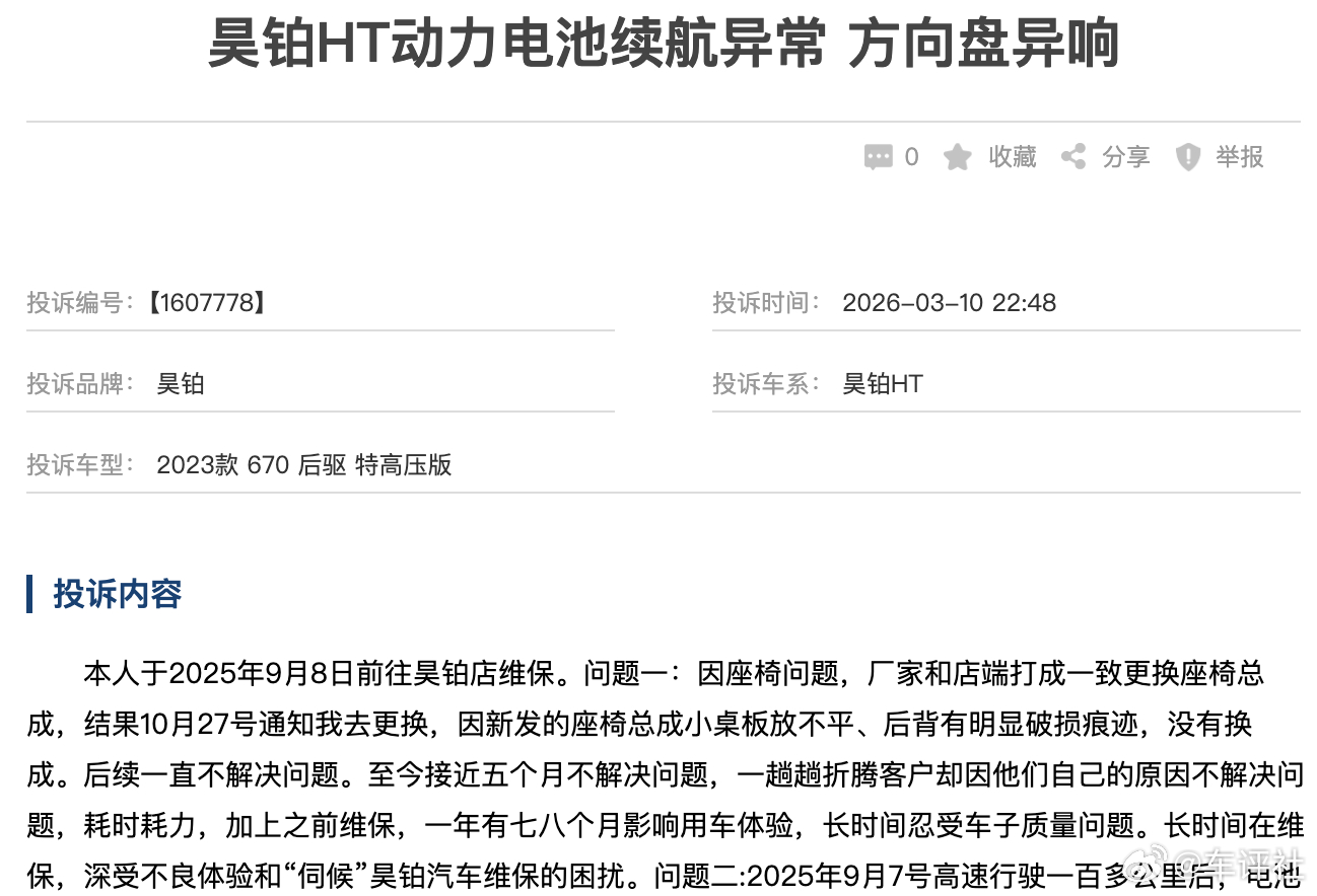 汽车315线上车展 【昊铂HT动力电池续航异常 方向盘异响】有网友投诉称,他购买的是一台昊铂HT( 2023款 670 后驱 特高压版),本人于2025年9月8日前往昊铂店维保。
