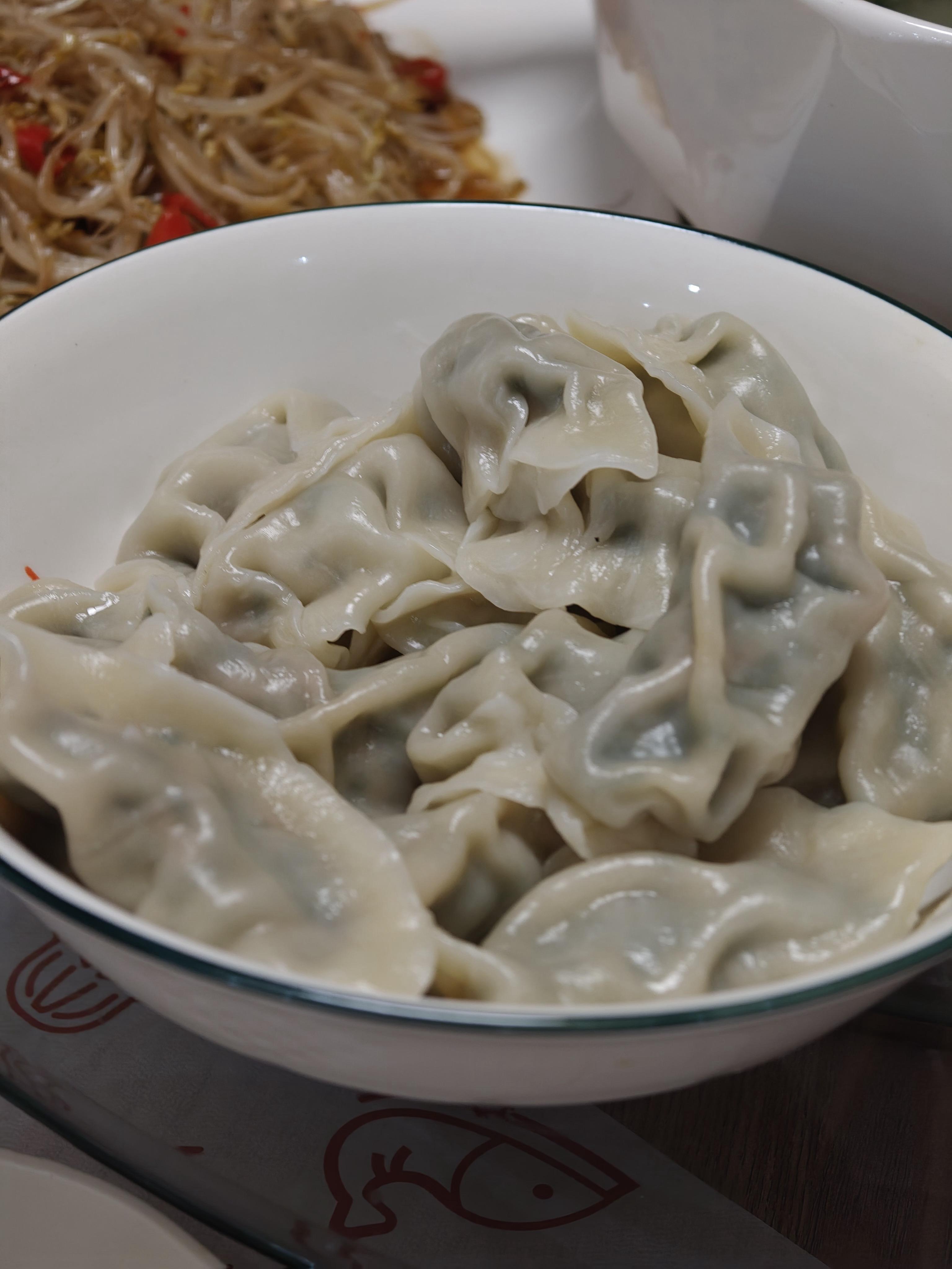 还好有俺妈包的饺子解辣,韭菜肉和芹菜肉,皮薄馅足,香得很~