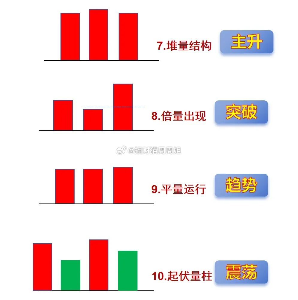 1️⃣ 阶梯增量,主力拉升;2️⃣ 阶梯收量,转为调整;3️⃣ 突爆天量,主力出货;4️⃣ 量能减半,调整洗盘;5️⃣ 凹型量柱,即将转强;6️⃣ 连续地量,底部将现;7️⃣ 堆量结构,主升行情;8️⃣ 倍量出现,突破上扬;9️⃣ 平量运行,趋势坚强;1️⃣0️⃣ 起伏量柱,区间震荡;