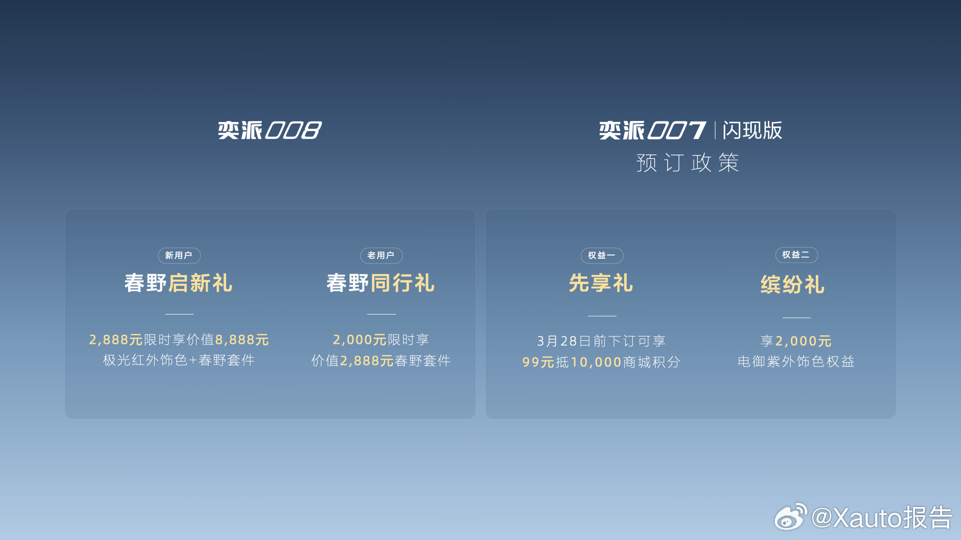 为回馈新老用户支持,推出限时购车权益,新用户下订极光红外饰色绑定春野套件限时先享价2888元;老用户可在APP下订春野套件,限时回馈价2000元。