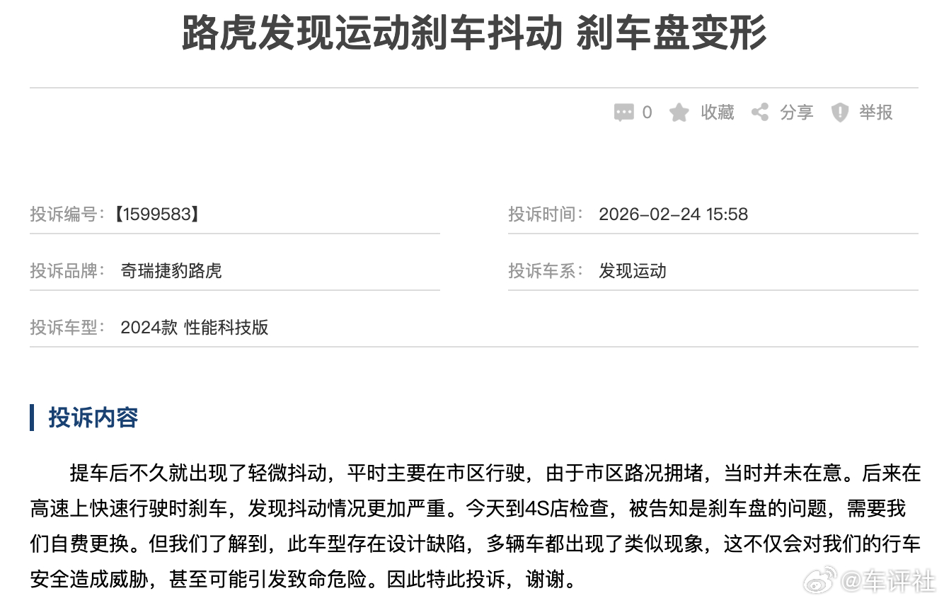 汽车315线上车展 【路虎发现运动刹车抖动 刹车盘变形】有网友投诉称,他购买的是一台路虎发现运动(2024款 性能科技版),提车后不久就出现了轻微抖动,平时主要在市车区行驶,由于市区路况拥堵,当时并未在意。质后来在高速上快速行驶时刹车,发现抖动情况网更加严重。今天到4S店检查,被告知是刹车盘的问题,需要我们自费更换。但我们了解到,此车型存在设计缺陷,多辆车都出现了类似现象,这不仅会对我们的行车安全造成威胁,甚至可能引发致命危险。因此特此投诉,谢谢。