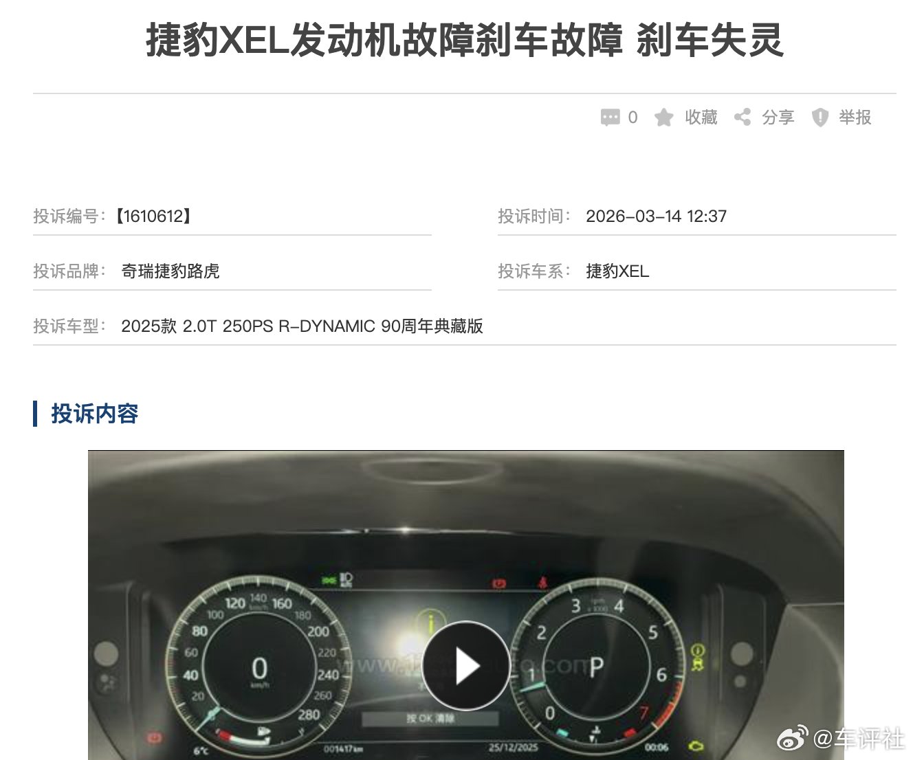 汽车315线上车展 【捷豹XEL发动机故障刹车故障 刹车失灵】有网友投诉称,他购买的是一台捷豹XEL(2025款 2.0T 250PS R-DYNA车MIC 90周年典藏版),在2025年11月份发现车辆油漆多处爆裂、车大灯螺丝生锈,并向服务店反馈该问题。12质月24日,车辆发生发动机故障、车身稳定系网统故障、刹车故障,且出现低速刹不住车的情况,12月25日将车辆拖至服务店维修。维修期间,服务店将刹车卡钳多处油漆刮伤、刮掉,我向服务店反馈后,对方称会核实并回复,且会处理此前所有反馈的问题,但截至2026年1月13日,我始终未收到任何回复。车辆存在严重质量问题,服务店服务态度极差。1月份,关于问题处理的基本条件已协商得差不多,但截至3月份,相关合同仍未出具。