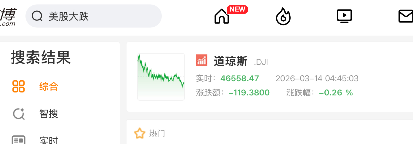 现在是2026年3月14日晚上9点55分,微博热搜显示美股大跌 特地去看了一下美股,昨天美股收盘跌0.26%,这尼玛叫大跌?