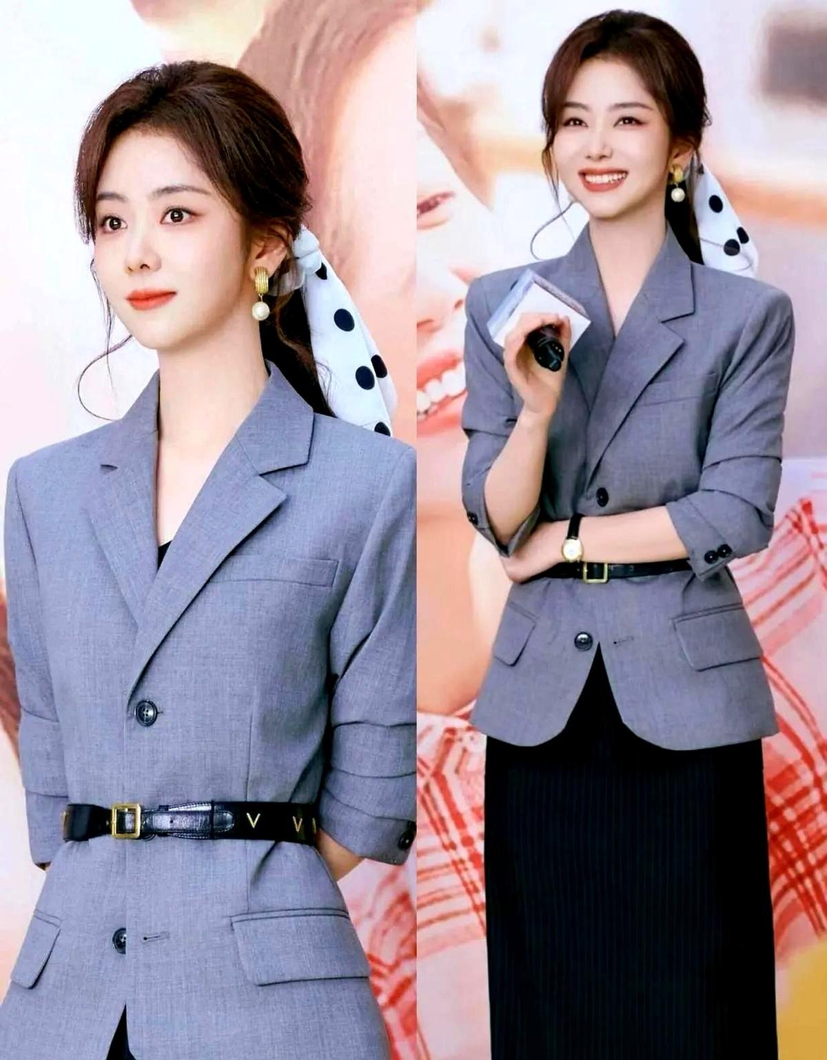 谭松韵这身灰西装,简直是小个子穿搭的教科书! 她真的太懂了…… 一张人畜无害的娃娃脸,搭上这么干练的套装,非但不违和,那种甜酷的劲儿一下就出来了! 看细节,全靠那根腰带。轻轻一系,腰线立马拉高,视觉上腿长两米,把身材比例拿捏得死死的。 最近她在新剧《我的山与海》演创业女性,里面的复古通勤风就特别火,看来是真把精髓穿身上了。 整套look简约又高级,中性灰色调超耐看,完全是职场人可以一周不重样搭配的范本。 这套直接照搬就行了,真的。