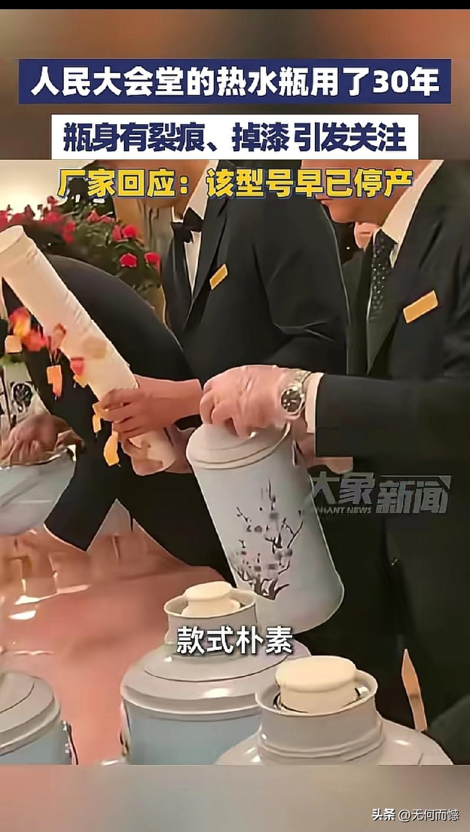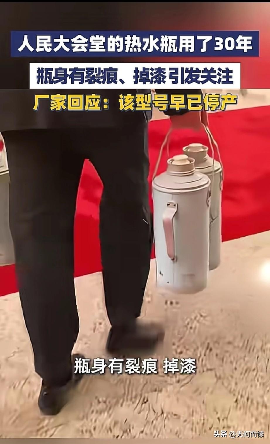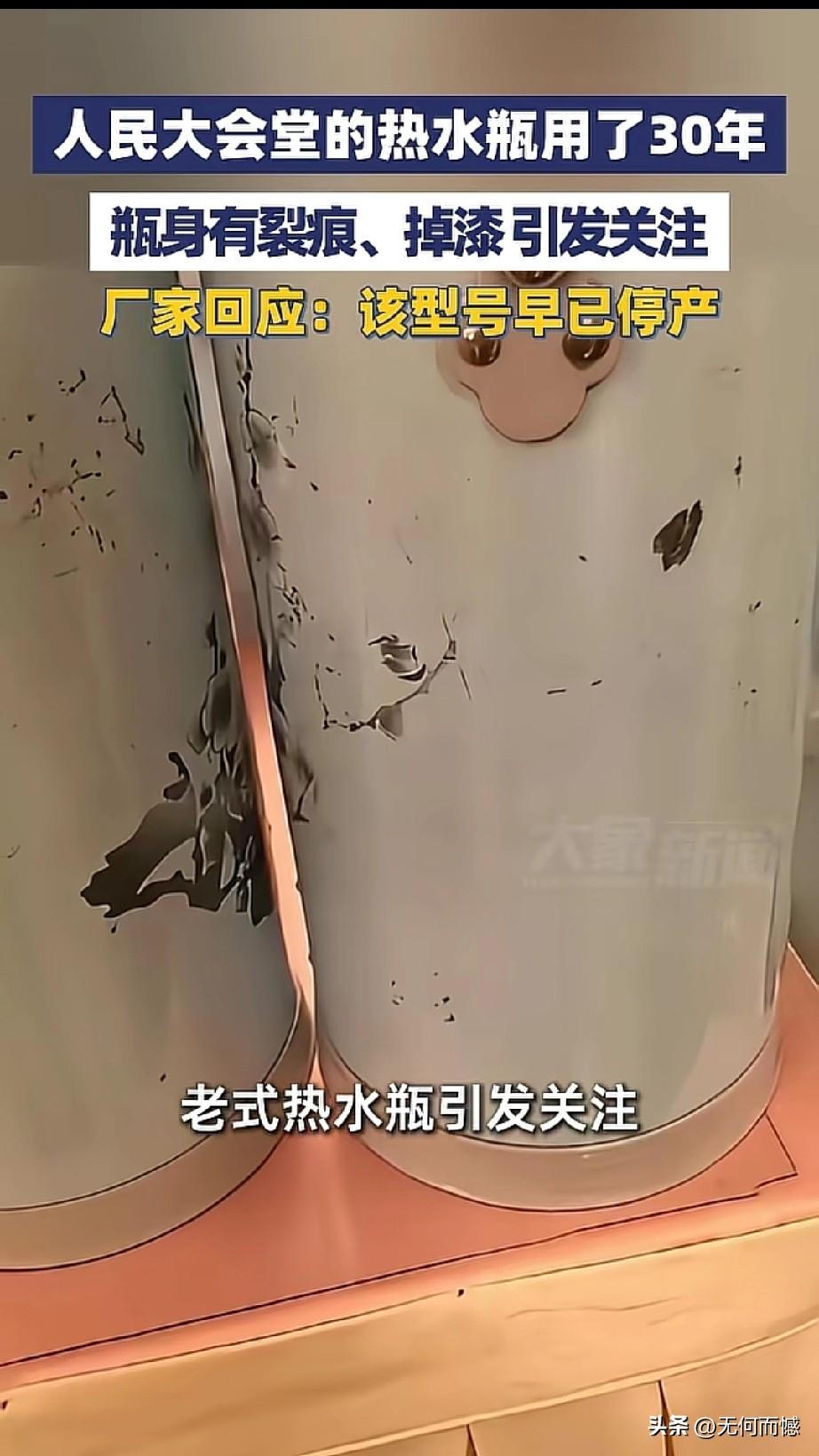 人民大会堂的老式热水瓶已经用了30年,款式非常的朴素,瓶身都有了裂痕和掉漆,厂家回应都已经不生产这个型号的了,看到这款老式的热水瓶,非常的熟悉,非常的亲切,记得在上个世纪90年代我结婚的时候,我一个好朋友就送我一对和这差不多的热水瓶,后来家里使用了桶装水、配上烧壶之后,现烧现喝,就不使用热水瓶了,由于搬了几次家,现在都找不到这些老物件了!