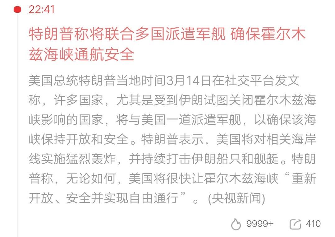 炸伊朗?特朗普放狠话:联合多国封霍尔木兹,要让海峡“重获自由”! 刚爆!特朗普当地时间3月14日突然发文,宣称要拉着多国派军舰硬闯霍尔木兹,还放话要猛轰伊朗海岸线、打击伊方船只,势要让这条全球能源命脉“重新开放、安全通行”! 这条海峡攥着全球近三成石油运输,一旦真动手,油价暴涨、供应链震荡恐怕只是开始…这是要把中东彻底点爆? 特朗普 霍尔木兹海峡 国际热点 中东局势