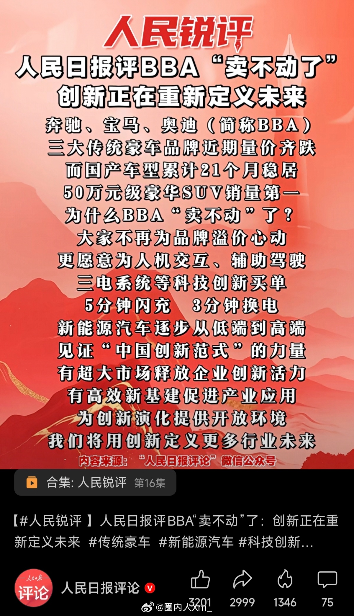 解读《人民日报评论》直接点名的品牌为奔驰、宝马、奥迪(合称BBA)但核心是以市场规律为标尺,锚定产业升级、用户获益、国家竞争力提升的终极目标。