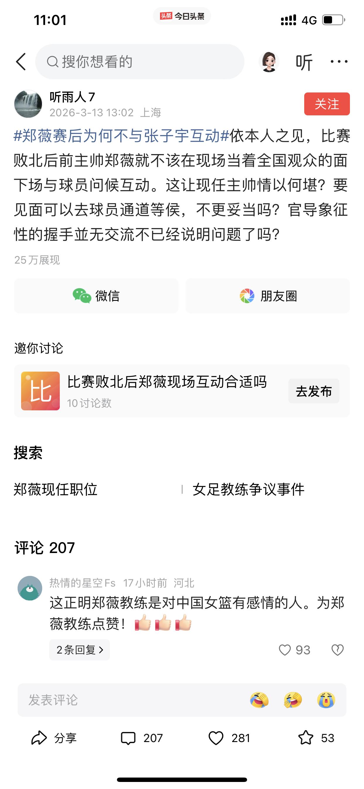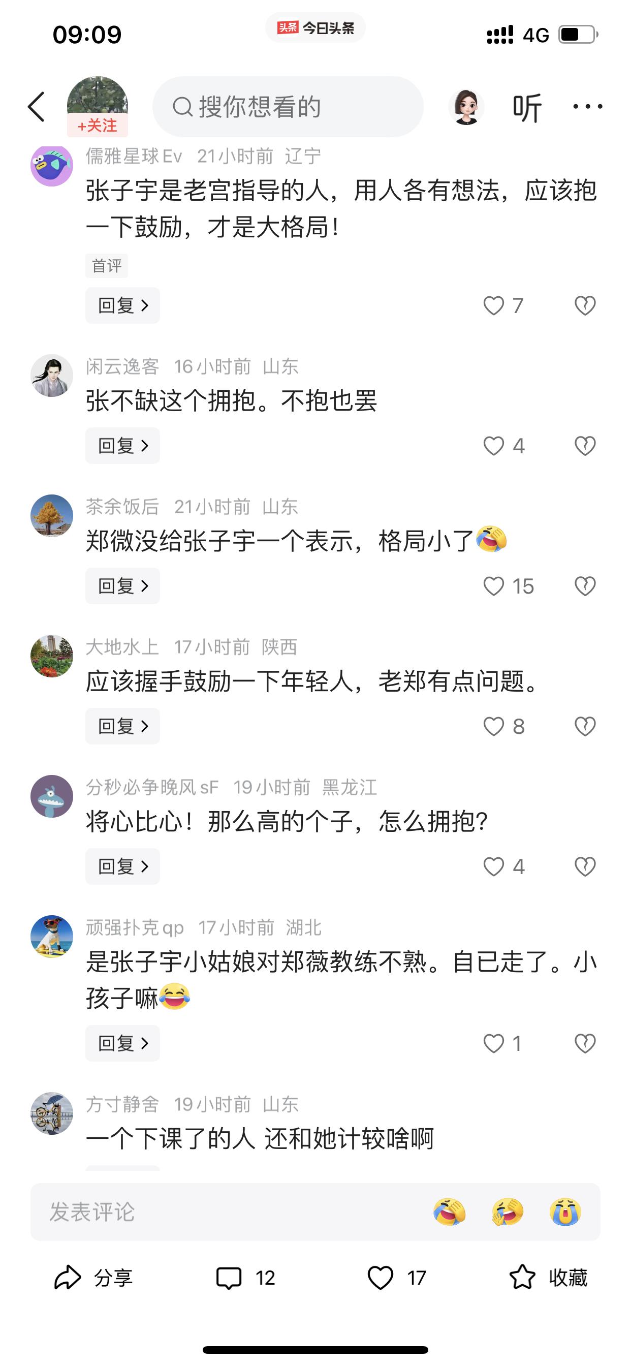 郑薇没有拥抱张子宇实属正常 (我完全搞不懂这个很正常的行为被网上一些人胡搞八搞的,到底哪来的脑洞?) 原因很简单,因为郑薇指导和张子宇在过去的人生当中没有任何交集,只能说双方通过如今的网络知道对方的存在 也就是说,换成你、我、他,肯定是跟熟悉的人拥抱,不可能跟一个只在屏幕上知道名字的人去拥抱 其次,郑薇指导是老前辈,张子宇没有主动,郑薇指导也不需要主动去报她,事实上因为两者的身体体型原因,也不好拥抱; 所以,也是基于以上两个原因,张子宇自己也就没有主动去拥抱郑薇指导 但是,后面在通道里面,郑薇还是与张子宇有过沟通,安慰了张子宇那输给比利时的沮丧以及累着的心情。 总而言之,郑薇指导没有拥抱张子宇是很正常的事情,完全不应该拿来在网上胡言乱语!