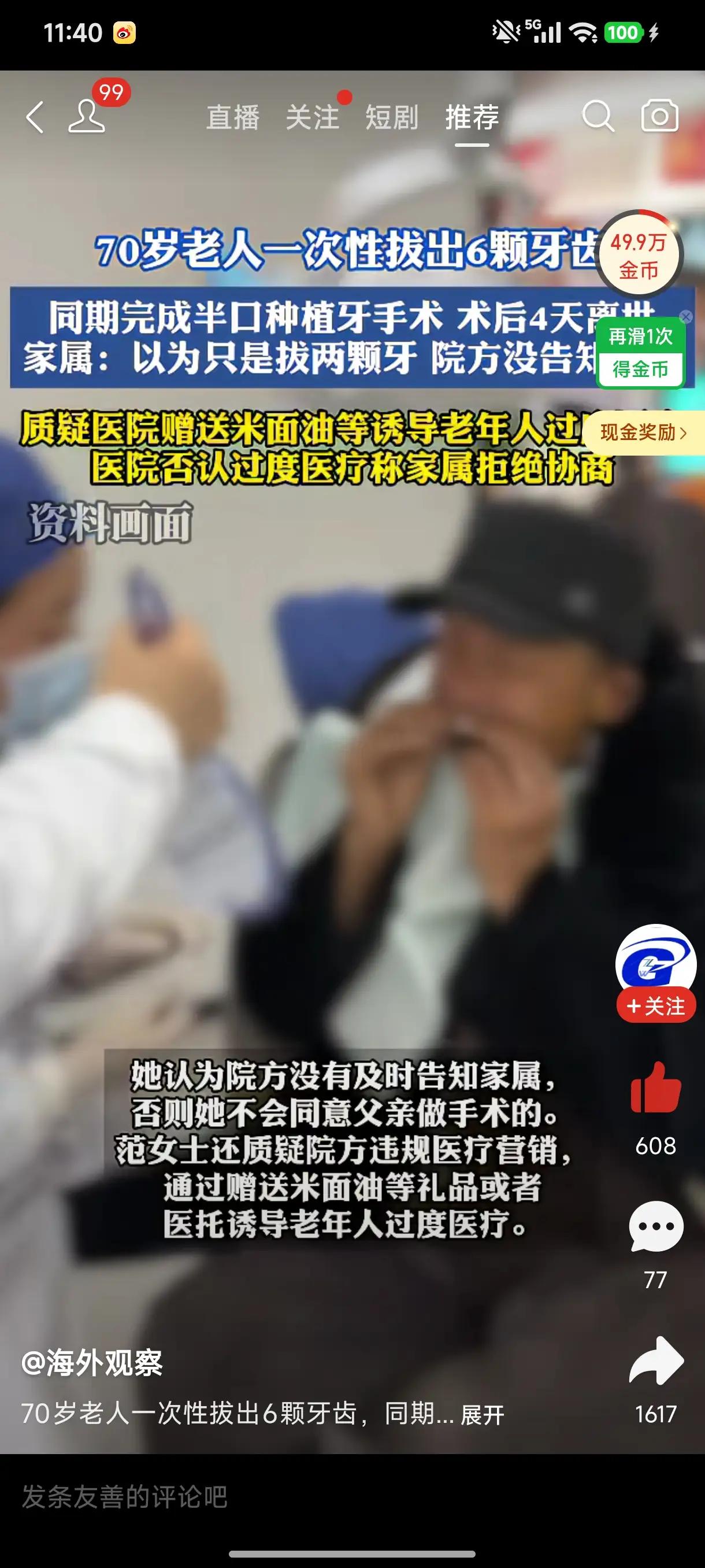 六颗牙、四天、一条命:老人种植牙背后的“完美”陷阱 1️⃣ 手术室外最后一通语音 “妈,医生说半小时就好,您别怕。” 这是女儿发给68岁刘桂芳的最后一条微信。4小时后,老人被推出来——脸肿得发亮,嘴里塞满纱布,像含了一颗滚烫的石头。谁都没想到,72小时后,监护仪上的绿线拉成绝望的直线。六颗牙,四万元,一条命。 2️⃣ “一口牙一辆宝马”不是段子 口腔诊所给刘阿姨的方案叫“All-on-6”:拔掉6颗松动牙,一次植入6颗种植体,当天戴临时牙冠,“上午种牙、下午啃苹果”。听起来像黑科技,其实风险条款藏在A4纸最下角: “高龄、高血压、长期服用抗凝药者,术中术后可能出现心脑血管意外。” 刘桂芳三项全占,却没人提醒。 因为销售顾问忙着展示“德国进口钛合金,一颗原价1.8万,今天团购价6666”。 3️⃣ 手术室里的48分钟到底发生了什么? 病历记录: • 10:15 开始拔牙,血压飙到190/110 • 10:32 快速植入第4颗种植体,老人心率骤降 • 10:48 手术结束,麻醉苏醒不完全,直接送回病房 没有心电监护延长观察,没有与心内科会诊——流程“完美”得像一条流水线,只差一个“完成”章。 4️⃣ 女儿在ICU门口崩溃: “我妈只是想好好吃顿饭啊!” 刘阿姨退休前是小学语文老师,牙掉光后只能喝粥,看到广告里“当天啃排骨”,咬咬牙拿出攒了十年的退休金。 她没告诉女儿,怕孩子嫌贵;女儿也没追问,怕妈妈心疼。两代人,一个“为你好”的默契,把风险悄悄放大成深渊。 5️⃣ 卫健委通报来了,但警钟才刚开始 诊所被停业整顿,主刀医生暂停执业。 然而打开社交平台,“当天种牙当天吃”的广告依旧蹦跶在热搜。 评论区最高赞只有一句话: “我们到底是在种牙,还是在被焦虑种韭菜?” 6️⃣ 彩蛋:那张没啃上的苹果 ICU清理遗物时,护士在老人枕头下发现一张折得方方正正的纸—— 是诊所赠送的“术后食谱”,第一行写着: “24小时后即可享用脆甜苹果。” 苹果没等来,等来了殡仪馆的车。 评论区留给你们: 如果爸妈跟你说想去“一口牙团购”,你会怎么劝? 你敢不敢晒出他们收到的种植牙广告? 别让刘阿姨的遗憾,成为下一条热搜。种植牙禁忌 种植牙误区 高龄种牙 种牙寿命