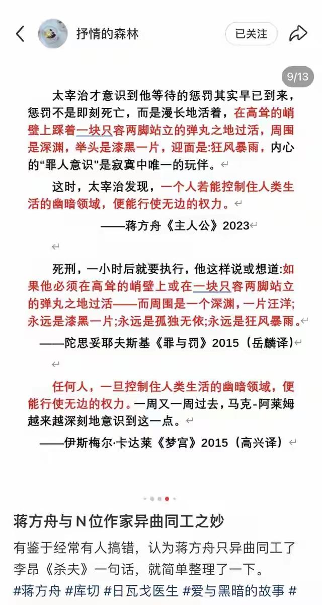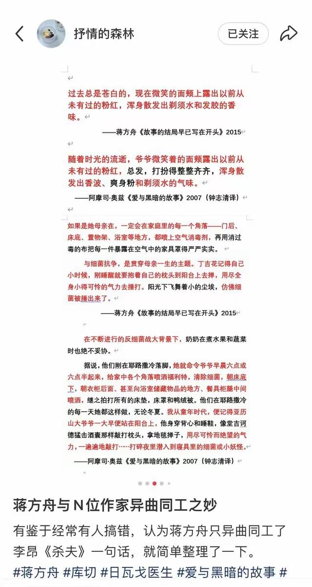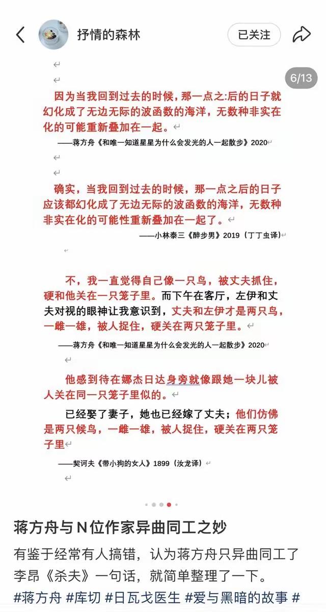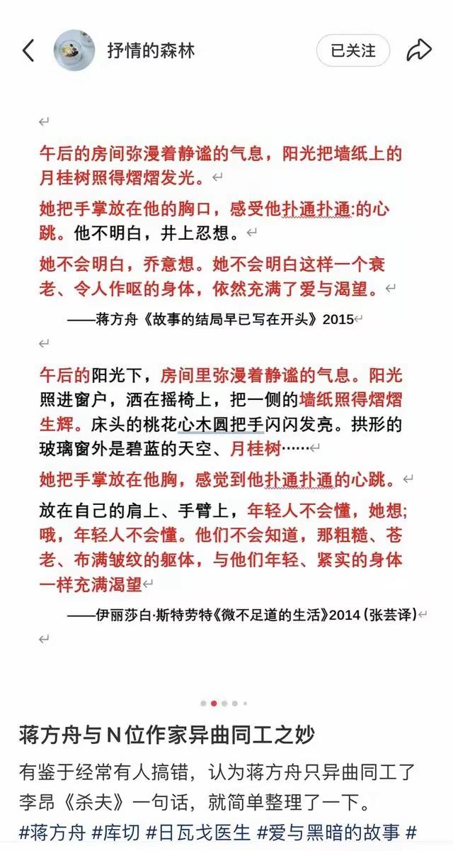 美女作家蒋方舟才女之名可能要垮了! 昨天,“文学鉴抄”博主“抒情的森林”发帖,直接指出蒋方舟涉嫌抄袭其他多位作家,很多片段看起来非常“像”,而且有些关键词,几乎照抄! 蒋方舟,天才少女,少女作家,美女作家。网上的说法是她7岁就开始写作,9岁出版首部散文集《打开天窗》;11岁的《正在发育》引发广泛争议……说实话,我读书的时候,她的“天才事迹”被广泛报道,我多次在报章上看到有关她的报道! 也正是因为她的写作“天赋”,还被清华大学破格录取。她的标签,一直以来就是“天才”。 但是现在,她这个身份可能要被凿穿了!从博主抒情的森林发出来的文章对比截图来看,几乎可以断定,她就是在抄袭! 完全没有想到,一个以天才写作出名的人,背后竟然干着这样龌龊的事!到目前为止,蒋方舟本人一直没有回应!你怎么看?