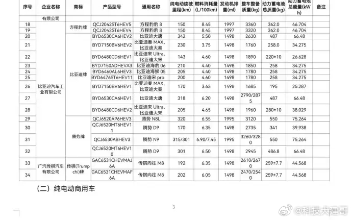 比亚迪这张表里塞了快20个型号,核心就俩字:细分。同一个“比亚迪大唐”,续航有318km和342km两个版本,明显在针对不同预算的用户。最狠的是秦MAX,最低油耗干到了3.63L/100km(馈电油耗),这几乎是对所有合资混动轿车的“屠杀宣言”。海豹06、海狮05这些新车,清一色用1.5L插混,油耗都在4.4左右,说明比亚迪这套DM-i系统已经像标准化模块一样,疯狂套用到各车型,成本压到极致了。