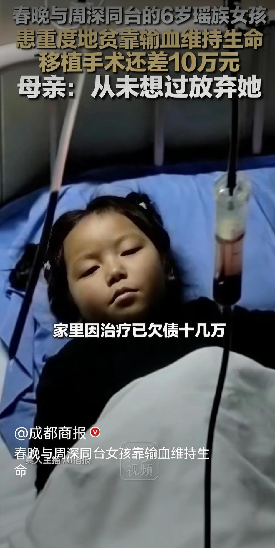 春晚最甜笑容背后,是每20天一次的输血!6岁“小飞侠”急需10万救命,妈妈一句话看哭全网 还记得今年春晚舞台上,那个和周深合唱《吉量》的瑶族小姑娘吗? 她穿着蓝盈盈的瑶族衣裳,眼睛亮得像星星,笑容甜得能融化人心。连周深都忍不住叫她“小机器人”,说她活力满满。 可谁能想到,这个在聚光灯下闪闪发光的小天使,从出生第二个月起,就被确诊为重度地中海贫血。 她叫杨佳羽,今年才6岁,来自贵州麻江的瑶寨。为了活下去,她每20天就要输一次血。春晚演出前一天,她还在北京的医院里输血,手臂上贴着止血贴,第二天却精神抖擞地站在了全国观众面前。排练45天,她输了两次血,却从没喊过一声累,也没让任何人知道她的秘密。 妈妈龙小英摆地摊、爸爸种蓝莓养鸡,两人月收入不到4000元,却要承担每月近3000元的治疗费。家里早已负债十几万,还有75岁的老人和读高三的哥哥要养。可妈妈从没想过放弃:“只要有一线希望,我绝不会丢下女儿。” 好消息是,陆军军医大学第二附属医院的专家已经为小佳羽制定了根治方案——用哥哥的造血干细胞进行移植,手术预计两三个月后进行。可30万的手术费,还差10万。这10万,是她通往健康的最后一道门槛。 小佳羽给自己起名叫“小飞侠”,她爱笑、爱跳、爱瑶族的刺绣和枫香染。她最大的心愿,是能健康地长大,继续站在舞台上,把瑶族文化传给更多人。 我们曾为她在春晚上的笑容心动,现在,请为她的生命接力。愿每一个努力发光的孩子,都能被世界温柔以待。