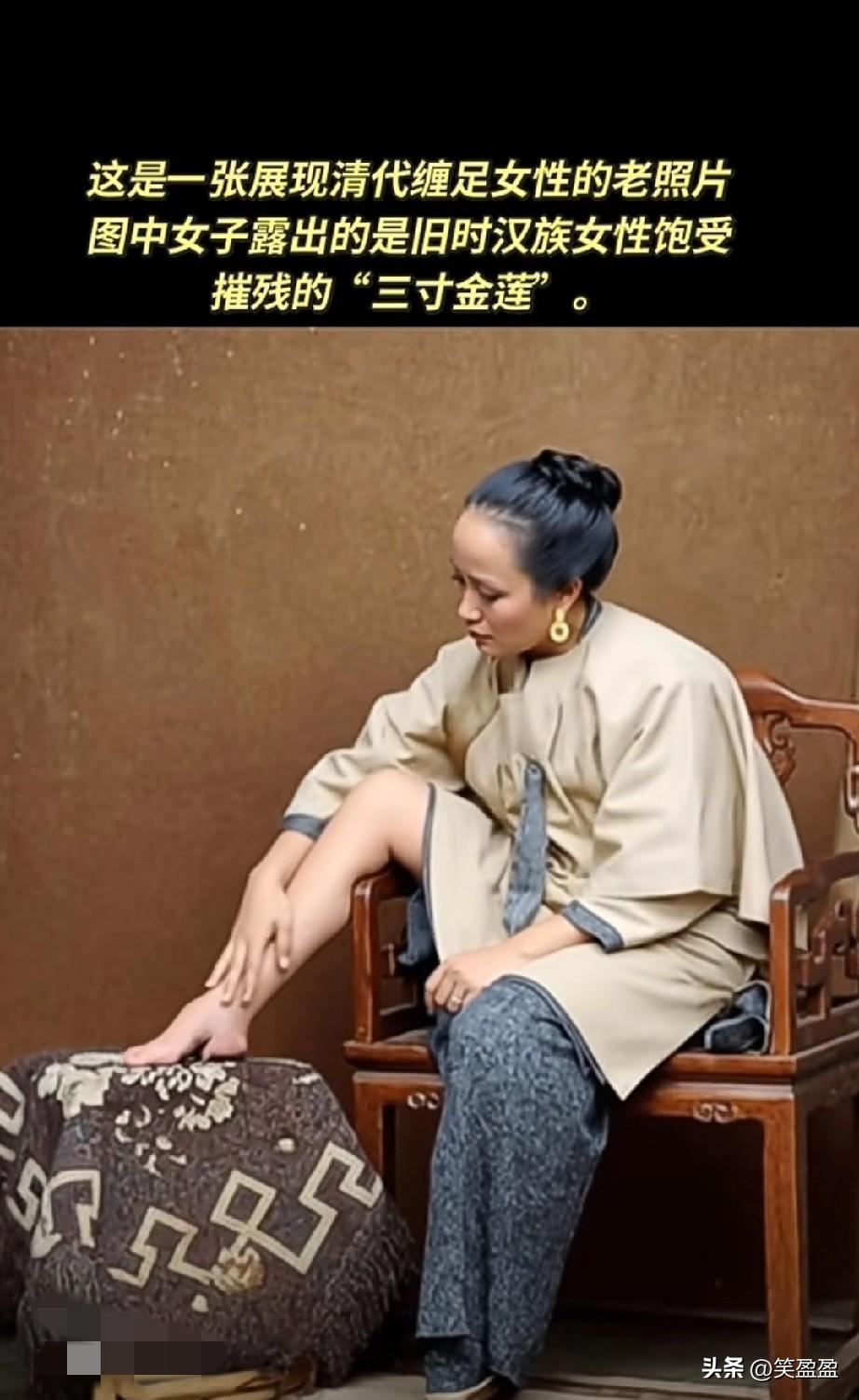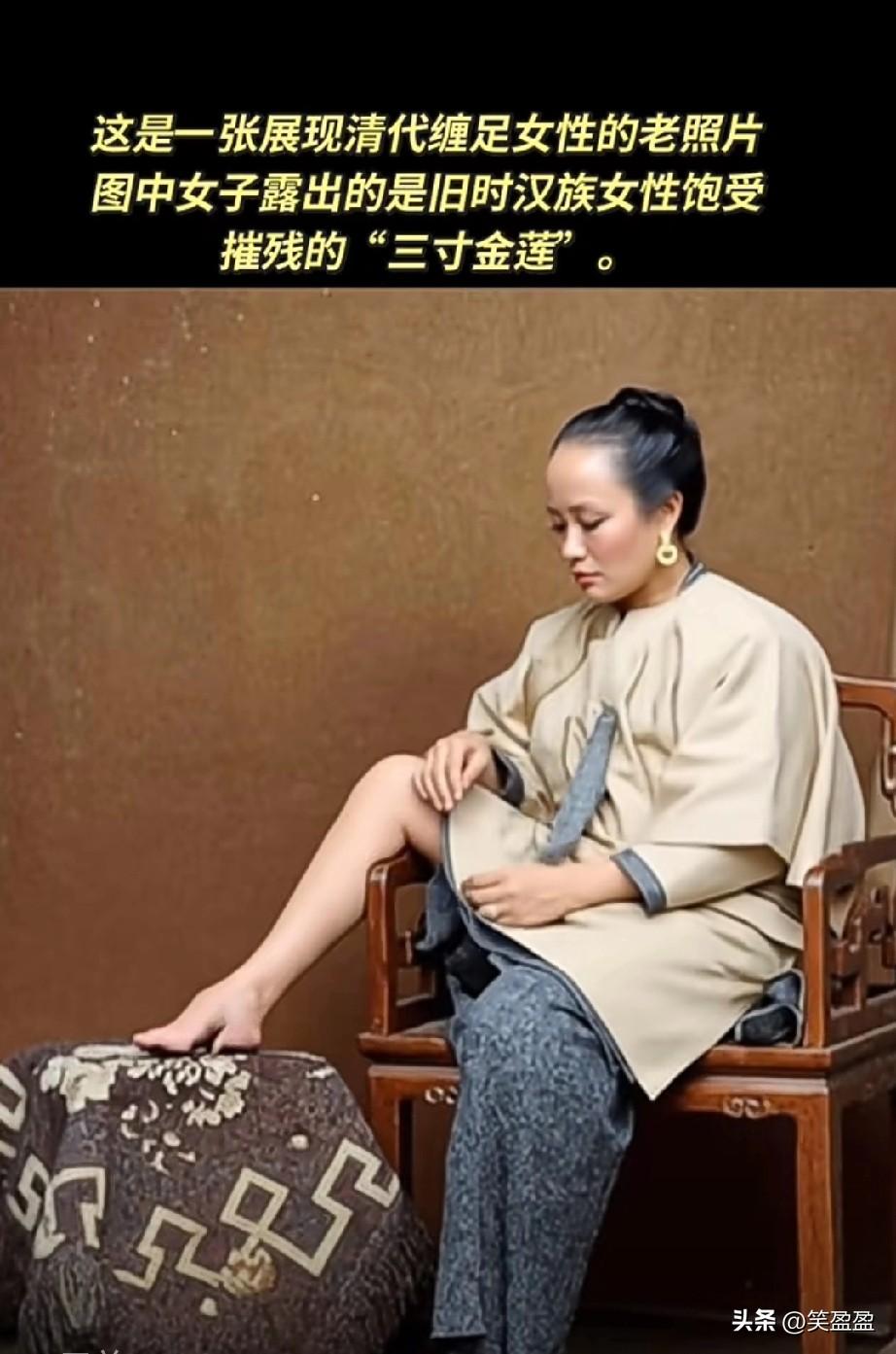这是一张展现清代缠足女性的老照片 图中女子露出的是旧时汉族女性饱受摧残的“三寸金莲” 那个时代的皇帝,虐待女人,把脚抱住折断,可怜的女人,看着都疼,小脚走路很艰难。