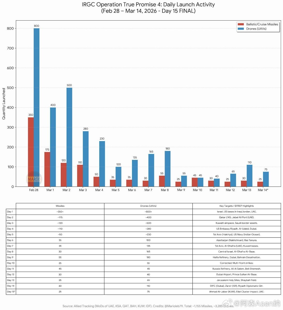 自3月9日以来,伊朗导弹和无人机的发射数量保持相对稳定,虽然低于最初几天的密集攻击,但伊朗在每个目标国家发射的导弹和无人机数量减少的情况下,命中率却不断提高,这说明目标国家的防空能力在不断下降。