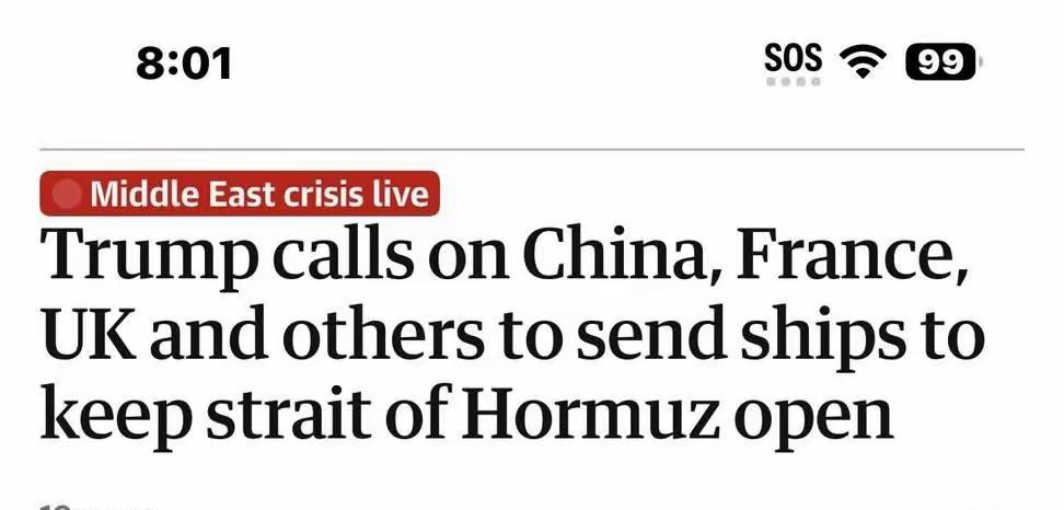 特朗普的幽默感真的是大大的有啊。 他发表推文,号称要召集“八国联军”出兵霍尔木兹海峡护航,轰开一条通路。 顺便还把中国也带进名单里来。 有网友评论:特朗普真是混世大魔王,这个世界是他的说打就打谁联合国都不在眼里。 美国外强中干,不拉帮结派就打不了仗! 对此,你怎么看?
