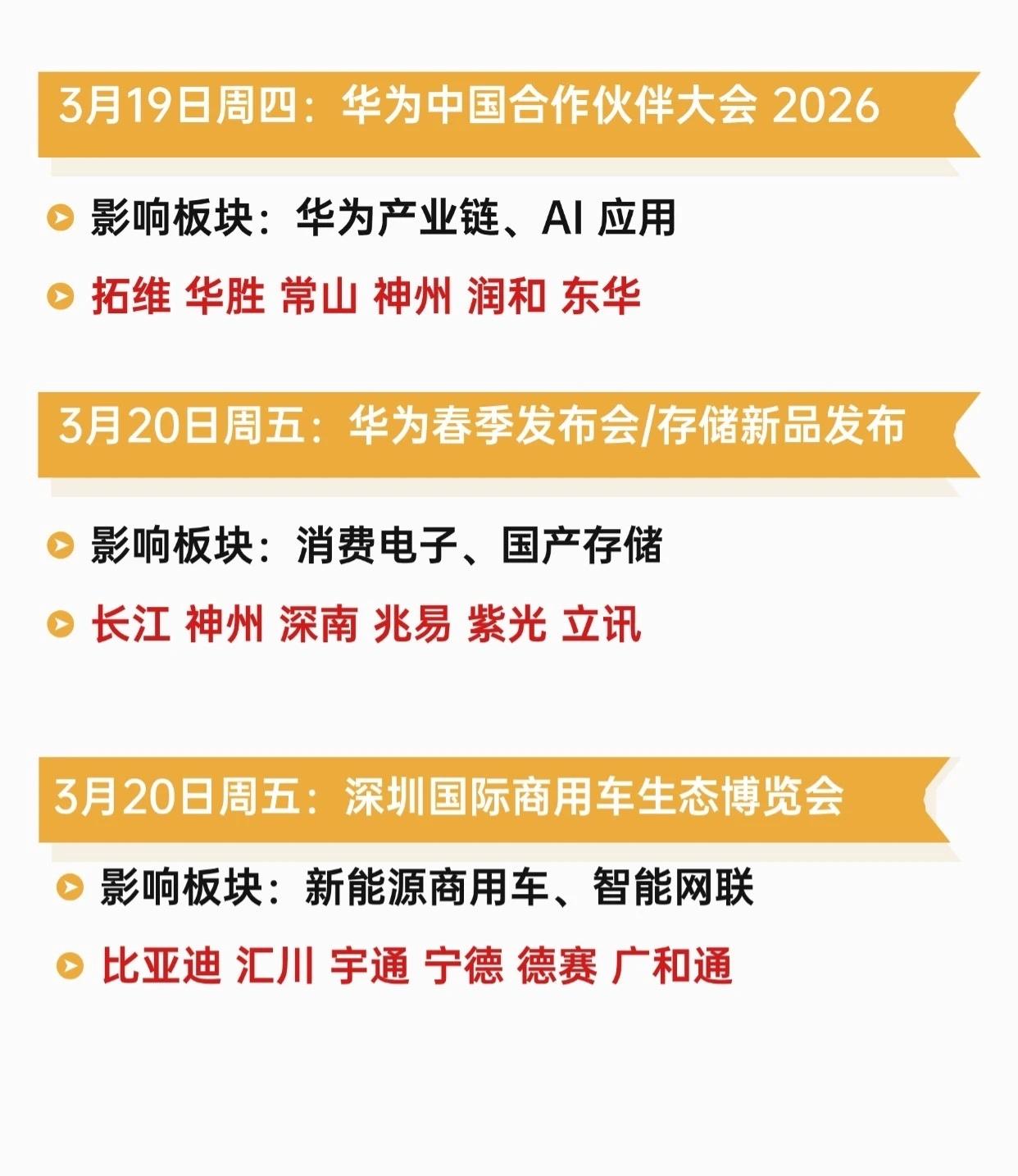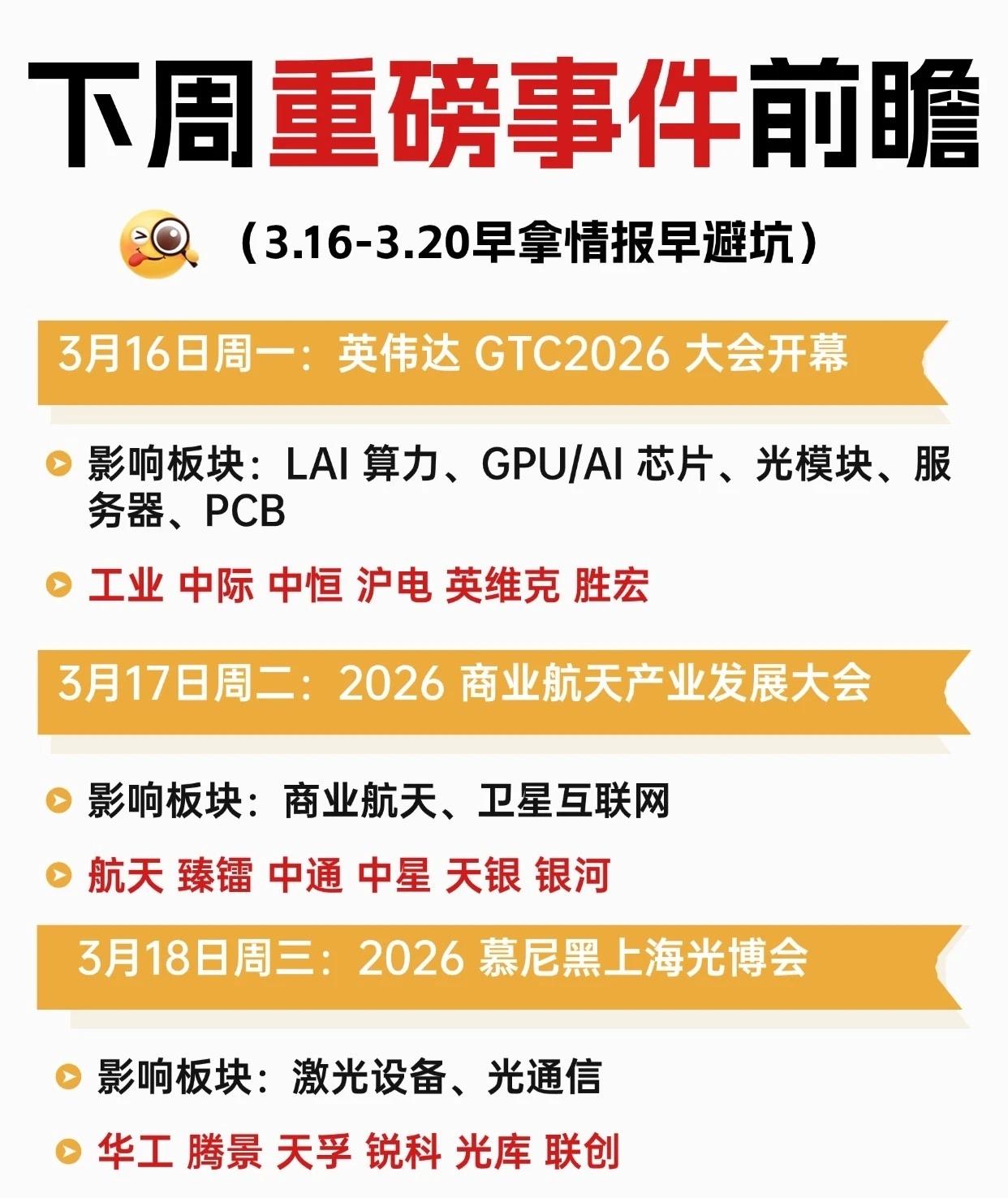 这是一份关于下周(3月16日 - 3月20日)重磅事件的前瞻总结,涵盖每日重要活动及其影响的板块与相关个股: 3月16日(周一):英伟达GTC2026大会开幕 - 影响板块:LAI算力、GPU/AI芯片、光模块、服务器、PCB - 相关个股:工业、中际、中恒、沪电、英维克、胜宏 3月17日(周二):2026商业航天产业发展大会 - 影响板块:商业航天、卫星互联网 - 相关个股:航天、臻镭、中通、中星、天银、银河 3月18日(周三):2026慕尼黑上海光博会 - 影响板块:激光设备、光通信 - 相关个股:华工、腾景、天孚、锐科、光库、联创 3月19日(周四):华为中国合作伙伴大会2026 - 影响板块:华为产业链、AI应用 - 相关个股:拓维、华胜、常山、神州、润和、东华 3月20日(周五):两场重要活动 1. 华为春季发布会/存储新品发布 - 影响板块:消费电子、国产存储 - 相关个股:长江、神州、深南、兆易、紫光、立讯 2. 深圳国际商用车生态博览会 - 影响板块:新能源商用车、智能网联 - 相关个股:比亚迪、汇川、宇通、宁德、德赛、广和通 整体来看,下周事件聚焦AI算力、商业航天、光通信、华为产业链、消费电子/存储、新能源商用车等热门赛道,可关注对应板块及个股的事件驱动机会。