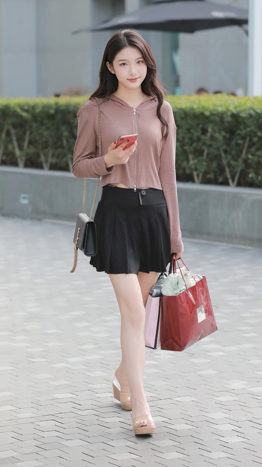 粉色开衫卫衣搭配黑色百褶裙,时尚迷人又甜美!