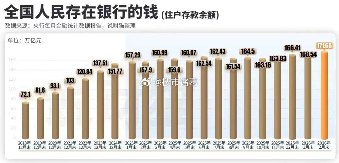 今年前两月,住户存款增加5.24万亿,全国人民存在银行的钱再次突破新高,达到171.65万亿……