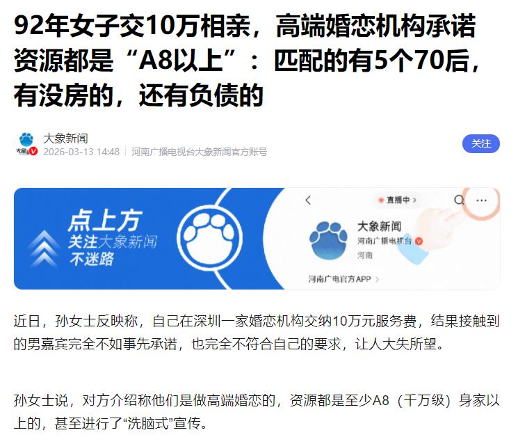 92年女子交10万相亲,高端婚恋机构承诺资源都是“身家千万以上”:匹配的有5个70后,有没房的,还有负债的 现在很多单身男女找对象都不容易,年纪一到,家里催得急,自己也慌,就想着找高端婚恋机构帮忙,觉得花点钱能少操心,还能找到条件好的。 深圳有个92年的孙女士,就花了10万块钱找婚恋机构,结果不仅没找到合适的,还气得不行。 孙女士是92年的,还没结婚,想着靠婚恋机构找个靠谱、条件相当的对象。她找的这家深圳婚恋机构,一上来就说得特别好听,说自己是做高端相亲的,手里的男生都是千万身家以上的,也就是他们说的A8以上。 大家不用记A8,就知道是千万富翁就行,对方还说,以孙女士的条件,找个几千万身家的都没问题。 为了让孙女士交钱,机构的人天天给她洗脑,拍着胸脯保证,一定把她嫁好,还诱惑她说,10万块钱不算啥,将来能换来一套房,甚至能找到身家一个亿的对象。 交钱前,他们还一个劲催,说有好几个条件好的男生等着见她,晚了就没机会了。 孙女士急着脱单,就信了他们的话,一次性交了10万服务费,本以为花这么多钱,总能找到靠谱的。可交了钱之后,机构的态度就变了,给她介绍的男生,跟之前说的完全不一样。 孙女士是92年的,本来想找个年纪差不多的,结果机构给她找的男生,最大的都51岁了,有5个都是70后,比她大十几、二十岁。 这些男生里,有离婚的,有好几个没房子,更离谱的是,还有人欠着债,跟之前说的千万身家,差得太远了。 孙女士跟这些男生聊天才发现,其中一些人根本不是这家机构的高端会员,有的是别的机构的,只交了一万八,还有几个根本没交钱。 孙女士觉得,自己交了10万,反倒被机构当成优质资源,推给这些不符合要求的人,这就是骗人。 她找机构要退款,对方直接拒绝,还说嘉宾资料包装很正常,人选没问题。这时候孙女士才想起,当初签合同的时候,对方让她别细看,说走个流程就行。 她再看合同才发现,里面根本没写推荐男生的条件,反而写着不保证资料真实,也不保证能找到对象。 现在孙女士已经报警、起诉,就等消息,记者联系这家机构也没人接电话。其实这种事不是个例,很多高端婚恋机构都这么套路。 他们就是抓住人脱单急的心理,靠口头承诺骗钱,合同上做手脚,交了钱就敷衍了事。 这里提醒大家,找婚恋机构千万别轻信口头承诺,尤其是要交高额服务费的,签合同一定要仔细看,不把承诺写进合同就别交钱。 收费高不代表靠谱,真要找,就选有正规资质、口碑好的,别一次性交全款。 孙女士这10万花得太亏,本来想省事儿,结果钱没了、心也气了。希望大家都擦亮眼睛,别被这些机构骗了,也希望相关部门能管管,让单身的人能安心找对象。