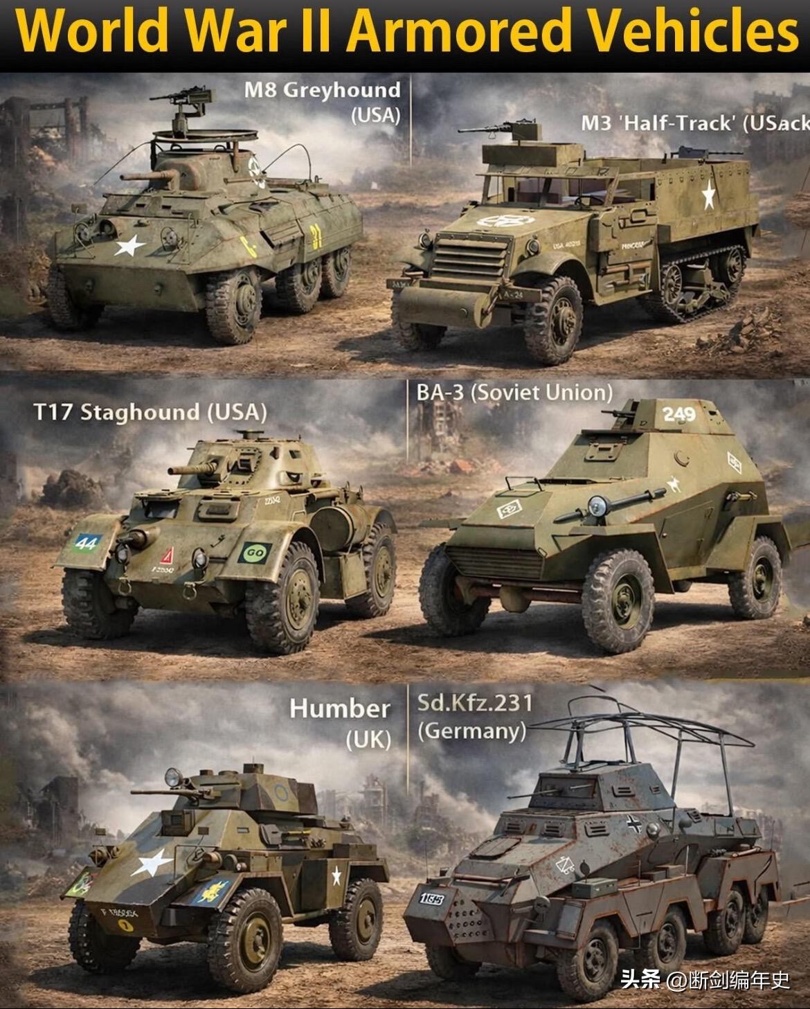 二战各国装甲车辆,它们虽然无法与主战坦克相提并论,却是各国军队不可或缺的“战场之眼”。 美国的M8“灰狗”与T17“猎鹿犬”是同盟国轮式侦察车的代表。M8凭借6×6驱动与37毫米主炮,在西线承担快速侦察任务;更重型的T17则以更强火力和防护,成为英联邦军队的主力侦察装备。M3半履带车则兼顾运输与机动,是美军机械化步兵的核心载体。苏联BA-3装甲车以45毫米主炮强化火力,在东线初期为步兵提供伴随支援与战场侦察。英国的“汉伯”侦察车小巧灵活,专注于前沿情报搜集与通讯联络。德国Sd.Kfz.231则是轴心国的典型代表,8×8驱动赋予其卓越越野性能,是德军装甲师侦察营的核心装备。 军事 军迷发烧友 武器装备 装甲车