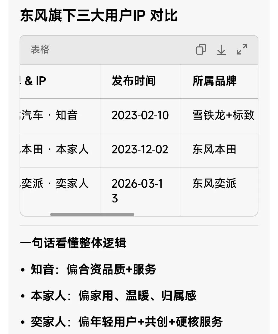 2026-03-14,东风奕派在贵州凯里千户苗寨发布「奕家人」用户IP,是东风继神龙「知音」、东风本田「本家人」后的第三个用户IP,主打用户共创+五大服务承诺 。 - 现场三车共创 - 奕派008上新(极光红+春野套装) - 奕派007闪现版(性能共创) - 纳米01 Cross(潮流共创) - 东风用户IP矩阵 - 神龙汽车:2023-02-10「知音」 - 东风本田:2023-12-02「本家人」 - 东风奕派:2026-03-14「奕家人」 图一为东风公司即将改变后的架构图。