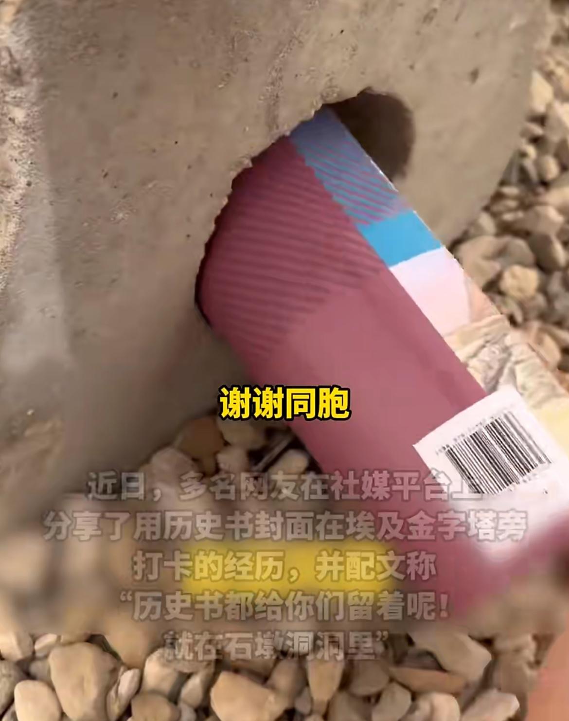 埃及独属于中国人的浪漫 中国网友在埃及用世界历史书合拍金字塔,并把历史书藏在了金字塔旁边的石墩里面。很多到当地旅游的中国网友,看到打卡点之后,会在石墩里面寻找教科书,然后拿出来合照,这种打卡有创意又很有意义,实在太浪漫了