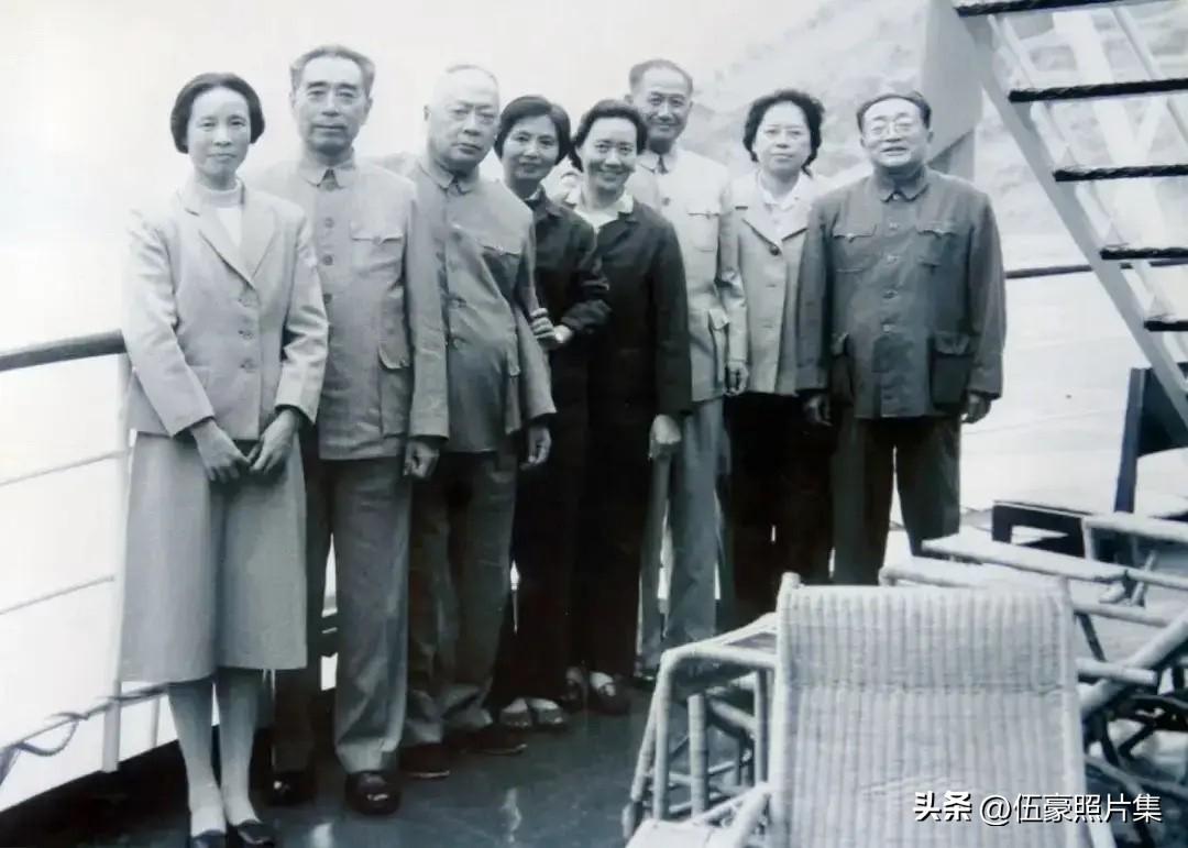 1965年9月27日,周恩来总理(左二)与陈毅副总理(左三)和夫人张茜(左四),陈叔亮大使(左六)和夫人康岱莎(左五),张颖(左一),章汉夫(右一)与夫人龚普生(右二)在长江三峡船上的合影。当时,周恩来总理和陈毅副总理正陪同柬埔寨国家元首诺罗敦·西哈努克亲王及夫人进行为期近一个月的国事访问。据亲历者回忆,在合影前,周恩来与陈毅相互谦让,最后周恩来坚持请翻译、礼宾官员和记者坐在中间,自己与陈毅分坐两边,体现了其一贯的谦和与对一线工作人员的尊重。