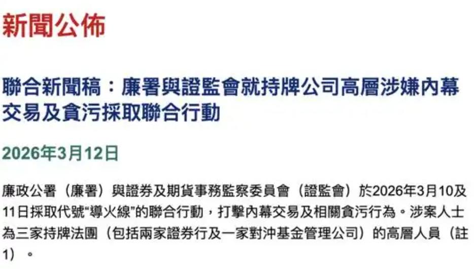 特大好消息!在国内横行霸道,到香港市场依然不收手,没想到香港廉政公署不吃这套,将国内两大券商的害群之马绳之以法。 2026年3月10日至11日,香港廉政公署与香港证监会联手开展代号“Fuse”的联合执法行动,针对港股市场内幕交易与商业贪污行为展开突击查处,两家中资头部券商的香港分支机构卷入其中,瞬间引发市场广泛关注。 这次行动直接逮捕了六男两女共八名涉案人员,年龄在35岁到60岁之间。调查显示,涉案证券公司的一名资深高管涉嫌收受对冲基金管理公司负责人提供的超过400万港元贿赂,提前泄露多家香港上市公司股票配售的机密信息。 该对冲基金利用这些内幕消息,通过卖空相关股票及签订空头股票互换合约建立空头头寸,当配售信息公布、股价下跌后平仓获利,非法获利高达约3.15亿港元。这意味着贿赂金额的回报率接近80倍。 涉案的两家证券公司分别是国泰君安国际和中信证券的香港子公司,对冲基金为香港无极资本。国泰君安国际在3月12日发布公告,确认香港证监会和廉政公署到访公司香港主要营业地点执行搜查令,并带走部分文件,公司一名雇员被廉署拘留调查。 这名雇员正是国泰君安国际股票资本市场主管潘举鹏。潘举鹏在香港资本市场有超过15年经验,2015年加入国泰君安国际,负责统筹IPO、二级市场配售等核心业务。他参与过宁德时代、优必选等多家知名公司的港股IPO项目。 中信证券香港办公室同样被突击搜查,有员工被问话。香港无极资本的一位投资负责人也被带走调查。数据显示,2025年至2026年3月11日,国泰君安香港子公司参与了11家IPO企业的股权承销,无极资本是其中4个IPO项目的基石认购者,包括迅策、卧安机器人、剑桥科技、HASHKEY HLDGS。此次内幕交易具体涉及哪几只股票,还有待监管机构进一步披露。 这次执法行动发生在港股IPO市场异常活跃的背景下。2025年港股有117只新股上市,实际募资总额达到2869亿港元,新股上市首日破发率约为27.35%,较往年有所下降。港交所排队企业数量一度接近400家。中资券商在港股IPO保荐市场中占据主导地位,市场份额超过60%。 市场繁荣的同时,监管层已经注意到潜在问题。2025年12月,香港证监会与交易所联名致函IPO保荐人,直言近期新上市申请中出现的质量下滑和部分不合规行为。2026年1月底,香港证监会发函对2025年新股上市申请激增期间的问题表示高度关注,并暂停了16宗存在严重文件缺失的上市申请审理。 股票资本市场部门是投行的核心利润中心,负责新股发行定价、机构配售等关键环节,权力集中,容易成为利益输送的温床。在香港市场,国际配售环节的违规操作集中体现在配售倾斜与私下返佣两方面。投行或账簿管理人将热门新股的稀缺额度优先分配给关联方、市场庄家及VIP客户,换取私下利益,并通过现金、股份或其他隐性好处进行返佣,形成隐蔽的利益输送链条。 与A股再融资需要严格审批不同,港股闪电配售机制进一步放大合规风险。港股依托股东大会年度一般授权,20%股本额度内无需监管事前审批,董事会可快速决策,收盘后公告最快24小时完成发行,且股份无强制锁定期。这种高效机制在活跃市场的同时,也给内幕交易和利益输送提供了可乘之机。 香港廉政公署的介入,将调查性质从一般的市场违规提升至可能涉及贪污贿赂的刑事范畴。涉案人员涉嫌触犯《防止贿赂条例》,包括向代理人提供利益及代理人接受利益,同时还涉嫌干犯《有组织及严重罪行条例》下的洗黑钱罪行和《证券及期货条例》下的内幕交易罪行。 在香港,内幕交易是最严重的金融犯罪之一,最高刑罚为1000万港元罚款和10年监禁。违法者还将面临民事制裁,包括没收非法利润以及最高五年的公司管理职位禁令和在受监管金融产品中的交易禁令。 短期来看,这次执法行动将对港股IPO市场产生一定影响。市场预计港股IPO节奏可能暂时放缓,各保荐机构将加强内部自查与合规审查,在新股定价、配售对象选择上会更加审慎透明。长期来看,严厉的监管行动将倒逼保荐质量全面提升、配售机制更加公平透明,有助于净化市场环境,巩固香港国际金融中心的公信力与竞争力。 这些在国内市场可能习惯了某种操作模式的人,以为到了香港还能继续横行霸道,但他们打错了算盘。香港廉政公署成立近五十年,以独立、专业、零容忍著称,从来不吃这一套。香港作为国际金融中心,法治是其核心基石,任何试图破坏市场公平的行为都会受到严厉惩处。 这次行动传递出明确信号:无论机构背景如何,无论涉及金额多大,只要触犯法律,香港监管机构都会坚决打击。这对于维护中小投资者利益、保障市场公平交易至关重要。当这些害群之马被绳之以法时,整个市场才能更加健康地发展,香港国际金融中心的地位才能更加稳固。