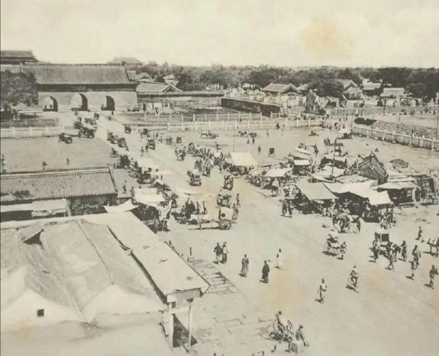 这张老照片是1900年庚子国变期间,八国联军占领北京后,在大清门(国门)前形成的临时市集。 大清门是皇城的正南门,位于天安门与前门(正阳门)之间,坐落于北京中轴线上,是帝国最高等级的礼仪之门。在原本空旷、肃静、仅供皇帝通行的御道及广场区域,如今挤满了熙熙攘攘的百姓和摆地摊的商贩。 照片采用俯视视角,这很可能拍摄于大清门或附近城墙、建筑之上。这种视角并非普通百姓所能轻易获得,推测拍摄者是占领军中的士兵、随军记者或外国摄影师。他们登上了原本戒备森严的禁区,以一种“观察者”或“征服者”的目光记录下这一混乱的景象。