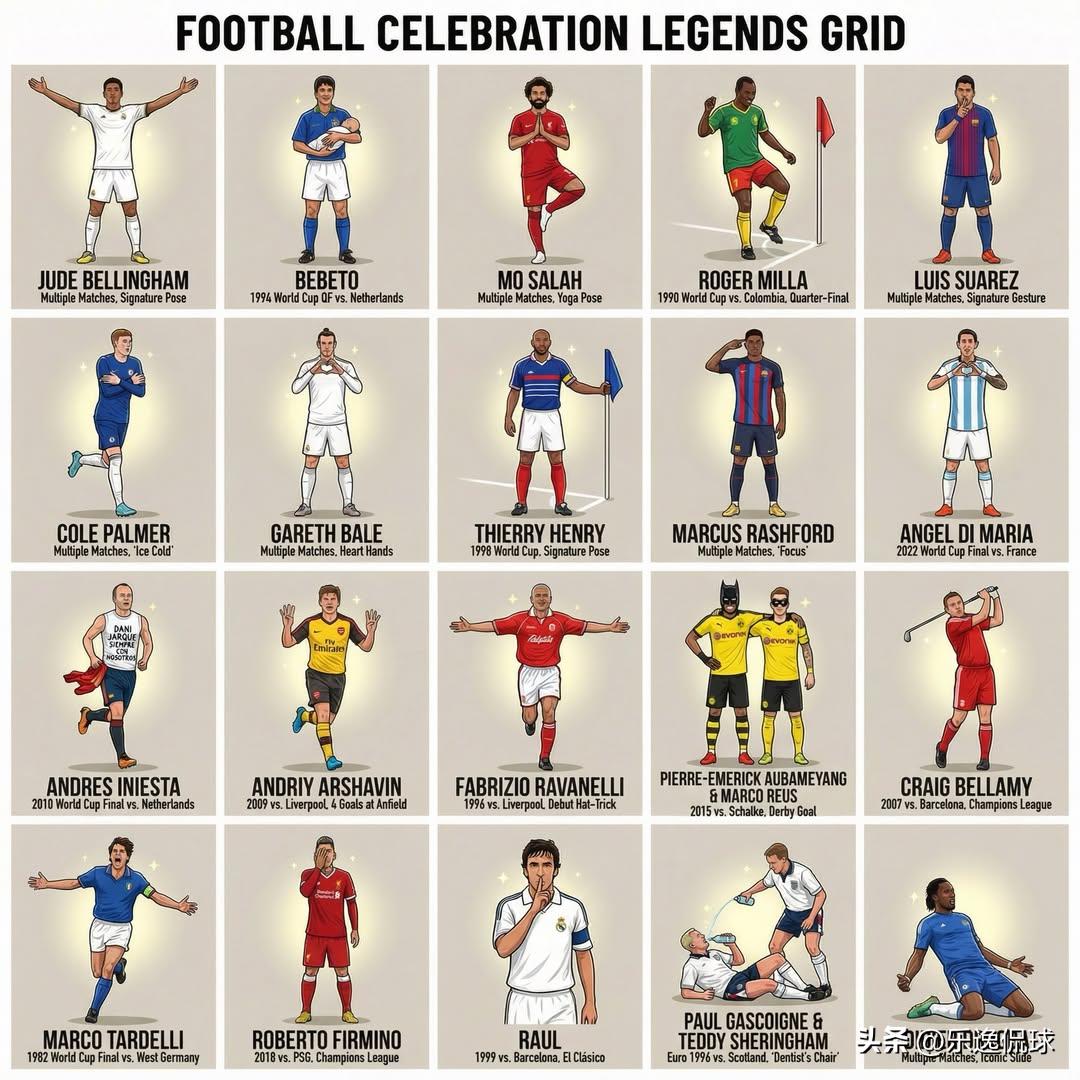 全看过的都是老球迷!足坛40大经典庆祝,哪个是你的青春DNA? 一个庆祝动作,就是一段足坛传奇,就是无数球迷刻进DNA的青春记忆! 这两张图里的40个足坛经典庆祝名场面,每一个背后都有一段热血沸腾的故事,能认全一半以上的,绝对是看球十年往上的老球迷了! 这里有足坛双骄的传世名场面: 梅西在伯纳乌举起10号球衣的霸气瞬间,是国家德比史上最经典的定格之一; C罗标志性的“Siuuu”,响彻了世界上每一座球场,成了足坛最具辨识度的庆祝动作。 这里有霸气侧漏的王者时刻: 坎通纳立领叉腰的君临天下,是曼联国王独有的睥睨; 巴蒂机枪扫射的狂野,是战神独一无二的标志; 哈兰德打坐的禅意庆祝,是新生代锋霸的专属印记; 巴洛特利“Why Always Me”的名场面,至今仍是足坛最出圈的名梗之一。 这里有载入史册的世界杯传奇: 米拉大叔的扭臀舞,是世界杯史上最经典的庆祝之一; 贝贝托的摇篮舞,是无数球迷心中最温情的世界杯记忆; 伊涅斯塔世界杯决赛绝杀后的脱衣庆祝,是西班牙王朝的巅峰注脚; 塔尔德利世界杯决赛的怒吼狂奔,是意大利足球的经典定格。 这里有属于英超的独家记忆: 鲁尼曼市德比惊天倒钩后的展翅庆祝; 阿兰希勒的单臂高举,是英超射手王的专属标志; 杰拉德滑跪亲吻镜头的名场面,是红军队魂的热血瞬间; 加斯科因的“牙医椅”庆祝,是欧洲杯史上最经典的名场面之一; 亨利扶着角旗的滑跪,是海布里之王的独家浪漫。 还有太多太多的经典: 孙兴慜的拍照庆祝、格列兹曼的打电话手势、姆巴佩的双臂交叉; 萨拉赫的瑜伽姿势、菲尔米诺的捂眼庆祝、德罗巴的跪地滑跪; 卡瓦尼的弯弓搭箭、迪巴拉的面具手势、贝尔的比心…… 每一个动作,都是一场比赛的高光,都是一个球员的生涯注脚,更是我们无数个熬夜看球的夜晚里,最鲜活的青春印记。 评论区聊聊,你最爱的庆祝动作是哪一个?还有哪些你心中的经典庆祝没有上榜?