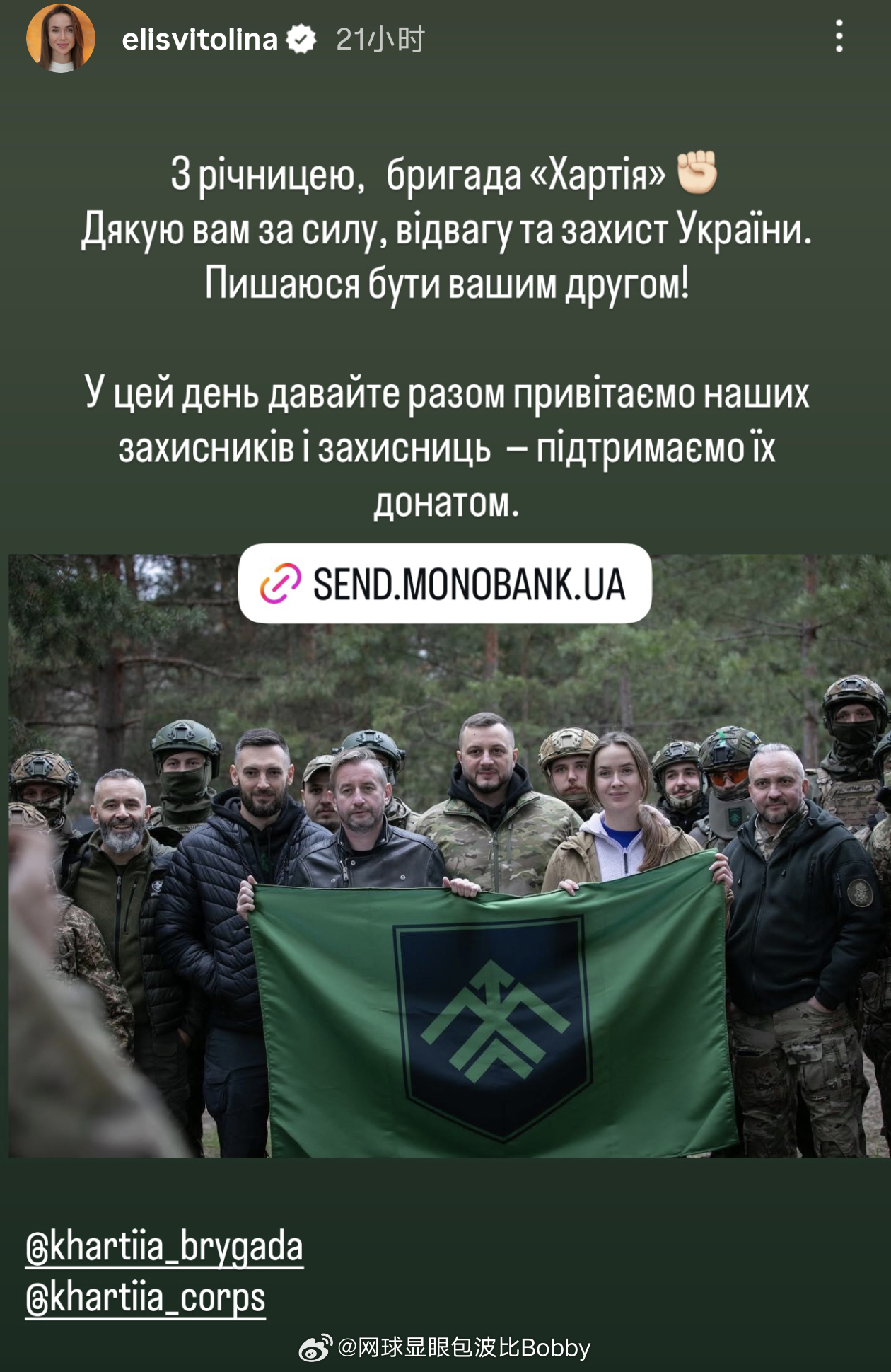 这段文字表达了斯维托丽娜对乌克兰某支军事单位的敬意和支持,并附上了一个募捐链接。网球