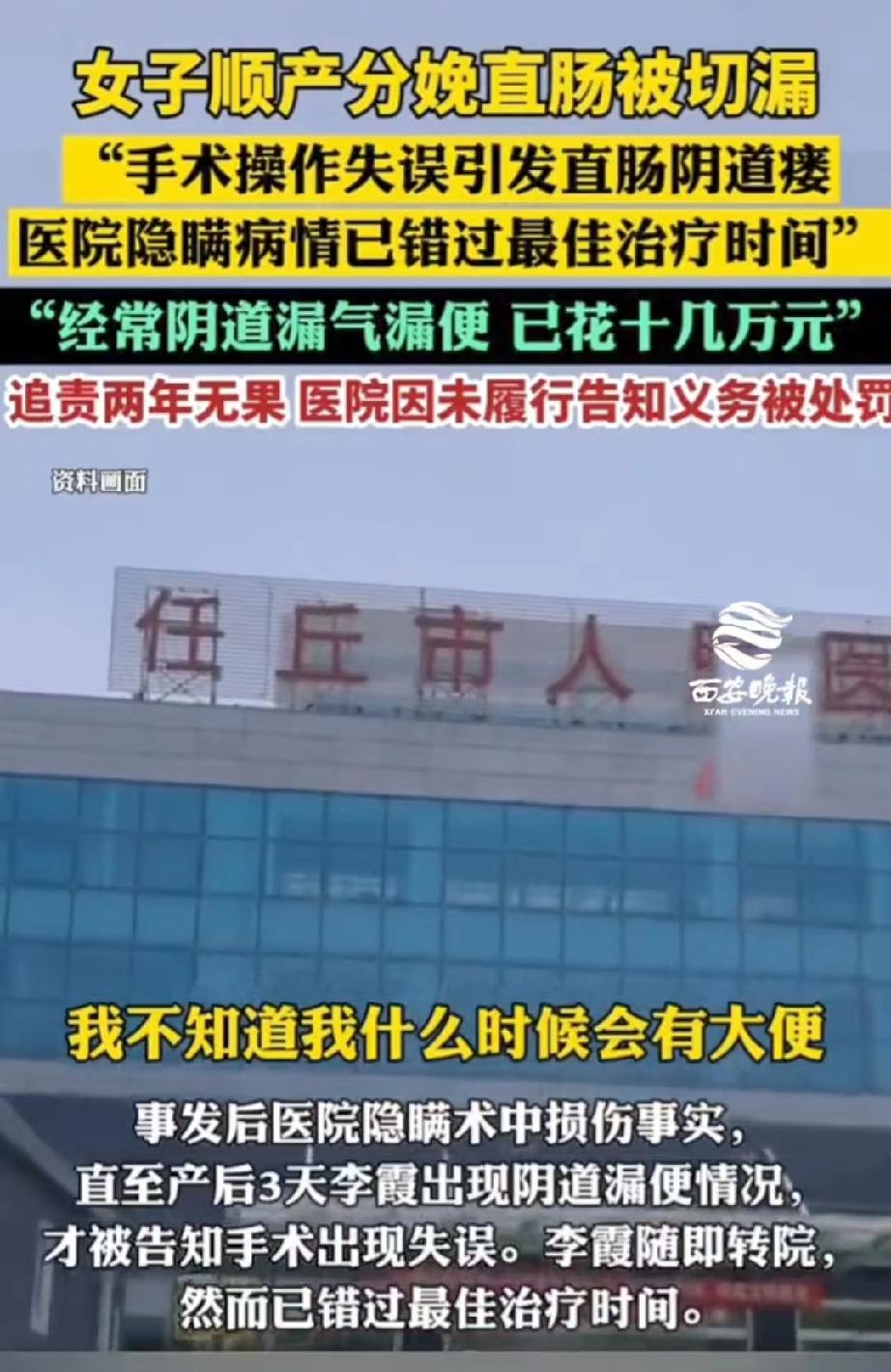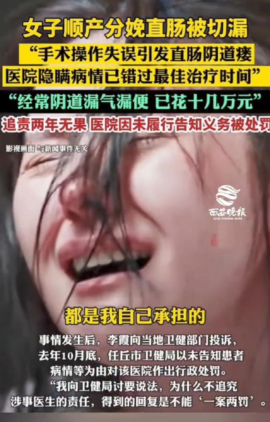 这样的医生还要祸害多少人?河北沧州,女子顺产分娩时,因侧切缝合手术失误,不慎引发了直肠阴道瘘,医生还悄悄隐瞒这一事实,等女子三天后发现阴道漏便漏气时,已经错过了最佳治疗时间,而且重度感染。从此以后,女子排泄不受控制,再也无法正常工作和生活,需要长期穿着纸尿裤。女子向卫健委投诉,卫健委只对医院罚款5万元,涉事医生一点事也没有,还在正常接诊,走投无路的她只能向记者求助。 2024年5月14日,李女士满心欢喜地来到任丘市人民医院,准备顺产迎接自己的孩子,她怎么也想不到,这场本该充满幸福的生产,会彻底毁掉她往后的正常生活。 当天顺产过程中,医生为李女士做了侧切缝合手术,可就在操作时出现了严重失误,针线直接穿透了她的直肠黏膜。 术中医生其实已经发现了这个问题,还拆除了穿透的缝线、重新缝合了伤口,却全程对李女士和家属隐瞒了实情。 手术结束后,医生只是告诉他们母子平安,还让李女士只吃无渣流食,按照常规产后护理对待,丝毫没有提及直肠受损的事。 李女士和家人满心都是新生儿的喜悦,完全没察觉到身体里藏着这么大的隐患。 直到产后第三天,李女士突然发现自己阴道里开始漏便、漏气,这才慌了神,赶紧到医院复查。 这一查,医院这才承认手术出了问题,诊断她患上了直肠阴道瘘。 随后医院妇产科主任陪着李女士紧急转往沧州市中心医院,可因为耽误了三天,伤口已经重度感染,医院根本不敢收治。 一家人又急忙奔波,最终在天津市人民医院顺利入院,可还是错过了最佳治疗时间,无法给她手术治疗。 检查结果显示,李女士直肠下端有一个指尖大小的瘘口,而任丘市人民医院此前的记录显示是缝合时缝穿了直肠,两种说法的性质完全不同。 正是因为医院当初的刻意隐瞒,没有及时处理,这才导致感染加重,让治疗难上加难。 从那之后,李女士开始了漫长的治疗之路。 她先花了一年时间做抗感染治疗,2025年终于等到可以做修复手术,可结果还是失败了。 医生告诉她,这个手术成功率本就不高,要是再找不到合适的医生,她就只能做造口手术。 身体上的折磨让李女士痛不欲生,她再也无法控制排泄,每天都要穿着成人纸尿裤,漏便、漏气的情况反复出现,还伴随着持续的感染。 因为长期住院治疗、无法正常休养,只能靠营养液维持身体,长此以往,她还患上了风湿病,彻底失去了工作和正常生活的能力,每天都被病痛和心理压力折磨。 这两年时间里,李女士光治疗费就花了十几万元,家里经济压力巨大,可医院始终敷衍推诿,没有给过任何合理的说法。 更让她心寒的是,当初操作失误的医生,在把她转到天津就医后,直接拉黑了她家属的联系方式,依旧在医院正常接诊,没有受到任何处罚。 李女士不甘心,先后通过12345热线、国家信访平台等多个渠道投诉维权。 2025年10月,任丘市卫健局终于作出处罚,以未按规定书写病历、未告知患者病情和医疗风险为由,对任丘市人民医院罚款5万元。 但是,卫健委却对涉事医生却不予追责,让他还继续接诊,给出的理由竟然是不能“一案两罚”。 对于这样不负责任的医生放纵,就是对无数产妇的不负责,李女士的遭遇不知道还会发生在谁的身上? 李女士无法接受这个结果,医院和医生明明是不同主体,犯错的医生却能毫发无损。她多次找卫健局讨要说法,都没有得到满意的答复。 两年维权路,李女士耗尽了精力和钱财,身体和精神都饱受摧残,走投无路之下,她只能向媒体求助,希望能为自己讨一个公道,让失职的医生承担应有的责任。 《民法典》第1218条明确规定:患者在诊疗活动中受到损害,医疗机构或者其医务人员有过错的,由医疗机构承担赔偿责任。 本案中,医生侧切缝合操作失误致直肠阴道瘘,且术中发现损伤后隐瞒未告知,违反诊疗规范与注意义务。 李女士因延误治疗致感染、手术失败及终身排泄障碍,损害后果与过错存在直接因果关系。 卫健委仅对医院罚款,却未对涉事医生追责,明显存在法律适用偏差。 依据《医疗事故处理条例》第55条规定,医疗机构发生医疗事故,对负有责任的医务人员可责令暂停执业活动;情节严重的,可吊销执业证书 。 医院与医生为不同责任主体,“一案两罚”的理由不能免除医生个人应担的行政与赔偿责任。 综上,李女士完全可以主张医疗费、护理费、残疾赔偿金等赔偿,并要求卫健部门对涉事医生另行作出行政处罚。