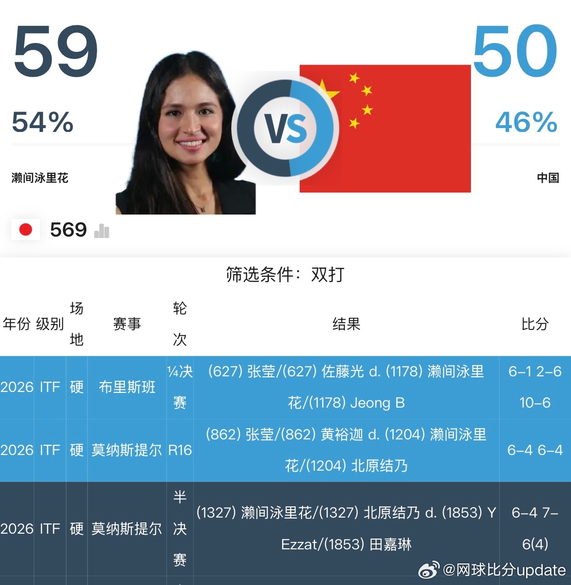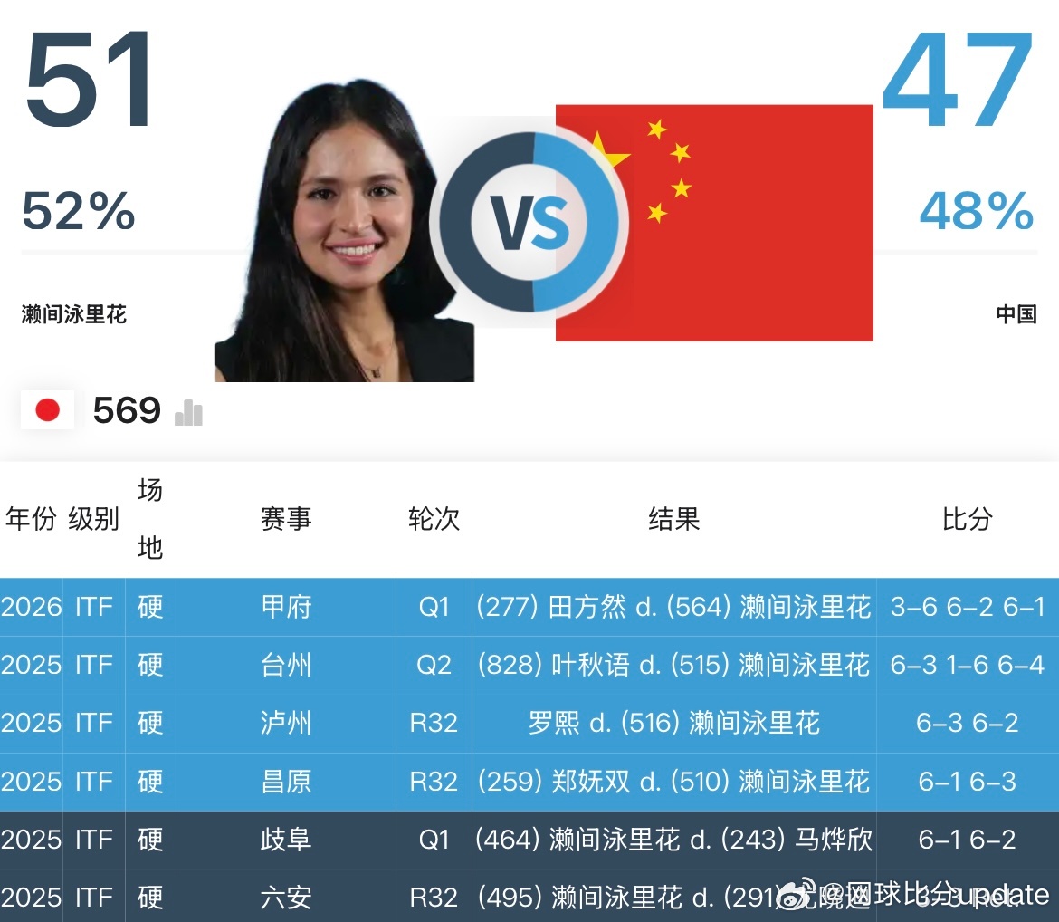🇯🇵W75女单资格赛首轮🇨🇳田方然3-6/6-2/6-1 🇯🇵濑间泳里花(E Sema)🇨🇳张莹6-7(4)/6-7(10)🇦🇺卡布雷拉