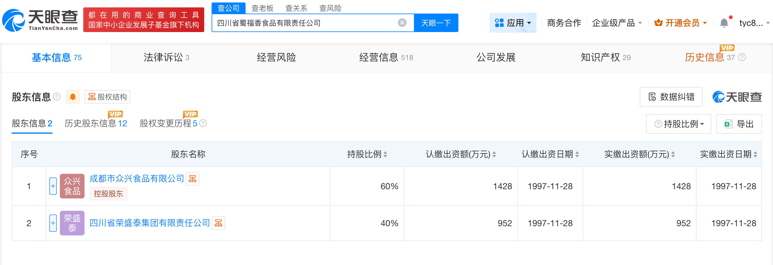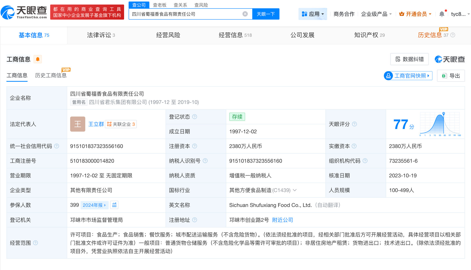 天眼查App显示,四川省蜀福香食品有限责任公司成立于1997年12月,法定代表人为王立群,注册资本2380万人民币,经营范围包括食品生产、食品销售、餐饮服务等,由成都市众兴食品有限公司、四川省荣盛泰集团有限责任公司共同持股。