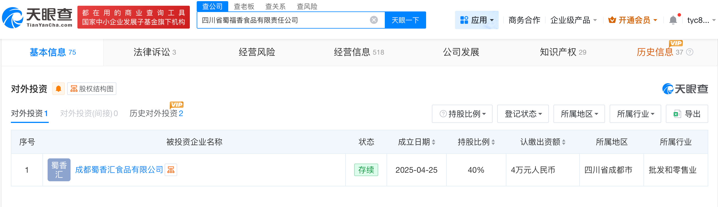 分支机构信息显示,该公司旗下四川省君乐集团有限公司聚友酒销售公司曾被吊销,目前处于注销状态。对外投资信息显示,去年4月,该公司对外投资了1家成都蜀香汇食品有限公司。#蜀福香食品去年成立新公司##315晚会#