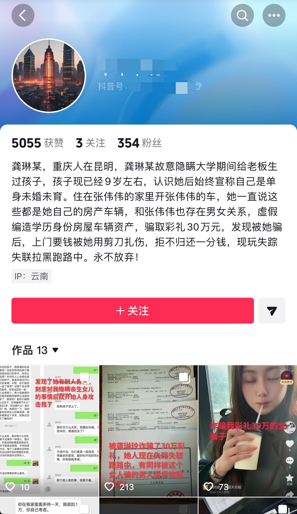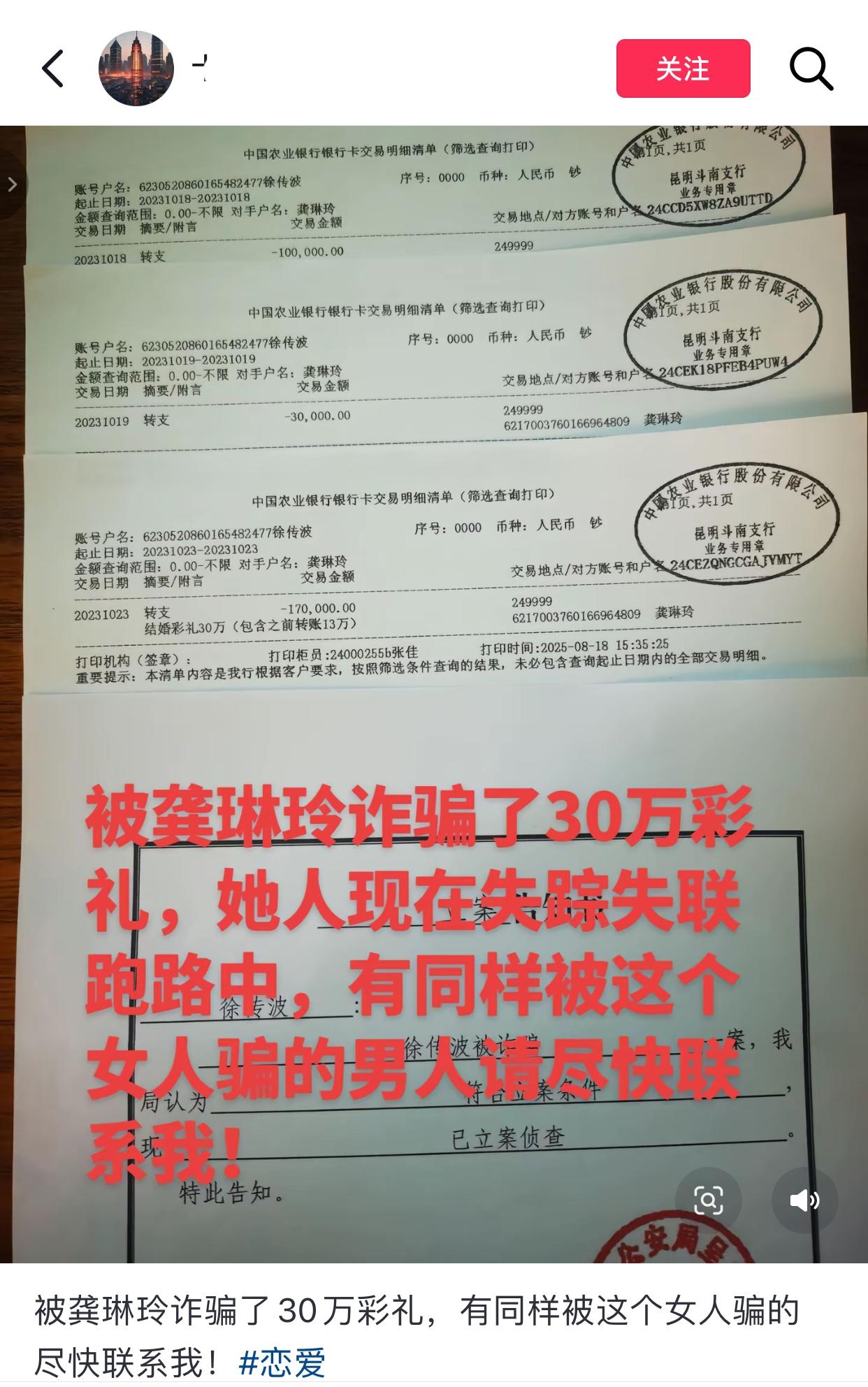 近日,看到云南一男网友爆料,他说他谈个恋爱被女方骗了30万彩礼! 网友说,在和她恋爱期间,对方不仅称自己单身,未婚未育,还编造学历,把别人的车子、房子说成是自己的!于是在2023年10月,网友先后转给对方30万,备注是结婚彩礼! 结果现在网友发现一切都是假的,对方不仅在大学期间就未婚先孕,给老板生过孩子,孩子如今都9岁了,还和房子、车子的原主存在男女关系,发现被骗后,网友想要回彩礼,结果对方拒不归还,第二次上门讨要还被对方用剪刀扎伤,如今把他联系方式都拉黑,然后跑路了… 之后网友又跑去对方身份证上的地址,结果早已人去楼空… 如今已经立案,有对方的身份信息,找人应该不难,不过这30万就不好说了…