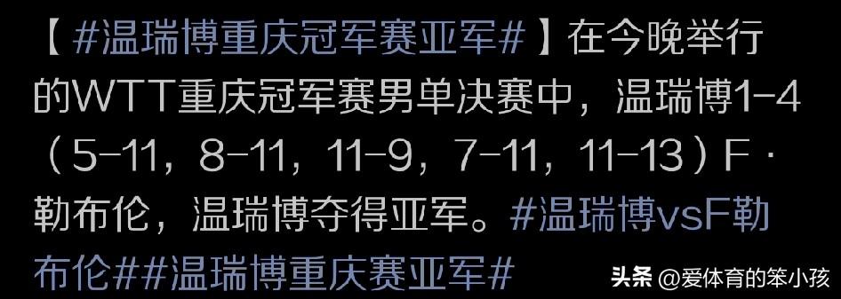 WTT重庆冠军赛最后一个比赛日晚间黄金时段迎来两场争冠战的比拼。结果率先登场的国乒小将蒯曼面对日本新星,也是现在日本女乒阵中实力最强的张本美和,在经过七局苦战之后,3:4惜败给对手,无缘女单冠军。 而后面年轻小将温瑞博,作为国乒男队在最终四强战当中仅剩下的一位国乒球员,也没能抵挡住法国小将,奥运单打铜牌得主费利克斯勒布伦的挑战,遭遇了一场1:4的失利,同样摘得单打亚军。双方五局的具体比分是5:11、8:11、11:9、7:11和11:13。国乒团队主场作战,最后却双双失去男女单打的两个冠军,也确实让人有些唏嘘。 整场比赛看下来,温瑞博还是在这场强强对话,特别是站到冠军争夺战赛场上的比拼当中,暴露出自己的一些问题。比如第一局他明显不适应小勒布伦的出手节奏,有点站不住位,经常在动态当中接球也影响了他的出手质量。所以一上来就1:6落后,最后也一直没有迫近分差5:11先失一局。 而第二局的比拼当中,其实温瑞博状态调整的还算不错,一上来一度4:0开局比分领先,但很快被费利克斯勒布伦用自己的线路和节奏优势重新打乱场上的局面,不但实现8:5的比分反超,还以11:8的比分再下一城,占据大比分上的2:0领先。 即使比赛的第三局,温瑞博在遇到困难的情况下打的还是比较顽强,而且从4:5落后追到7:7平。并在局末关键分上连续得分实现了从8:9~11:9的逆转胜出,也让自己把双方大比分改写成了1:2。 不过来到第四局的比拼当中,温瑞博又是开局处于明显落后状态,小勒布伦是迅速拿到8:2的比分领先,他的率先上手,还有高质量进攻,包括大角度的变线,也让温瑞博在场上有点跟不住节奏,并且适应不了这种比赛中的连续变化,导致他在中后局一度7:9迫近比分的情况下仍然被小勒布伦以11:7的比分再下一城,双方大比分来到3:1。 而进入第五局的比赛争夺当中,温瑞博开局2:5继续比分落后,但后面他其实打的比较顽强。一度连续迫近比分,并在局末10:8反超比分并率先拿到了局点,可惜在温瑞博的局点上,他自己打的稍微有些保守,还出现了关键分失误,导致费利克斯勒布伦连续得分,并在双方战成10平和11平过后,以13:11的比分再下一城,就此实现了4:1的胜出夺冠。 这样的一个费利克斯勒布伦确实越来越展现出了打硬仗和关键战,包括决胜场次的心理优势和技术优势。而温瑞博虽然在前面一路过关斩将,甚至把莫雷加德和张本智和这种顶级高手给淘汰出局,但打到决赛当中,还是缺乏了一些关键战当中与顶级高手决一胜负的经验,同时在比赛节奏的把控方面也稍显不足,最终遭遇了一场1:4的失利。 不过即使只是拿到一个单打亚军,对于温瑞博来说这也是一大进步和突破。毕竟国乒所有的男线球员最终四强当中也只剩他一个人,能拼到这样的一个结果,已经算是体现出了自己的上升势头和未来的上升空间。让我们期待着温瑞博能在未来的比赛场上继续突破自我,不断取得更多的好成绩。 我们也需要对F勒布伦这样的对手给予点赞,毕竟年轻的他在决赛中的表现确实配得上这样一个冠军。还在国乒球员的主场拼下这样一个含金量很足的冠军就更是证明了F勒布伦的成长和成熟。让我们给温瑞博加油的同时,也恭喜菲利克斯勒布伦这样的对手!