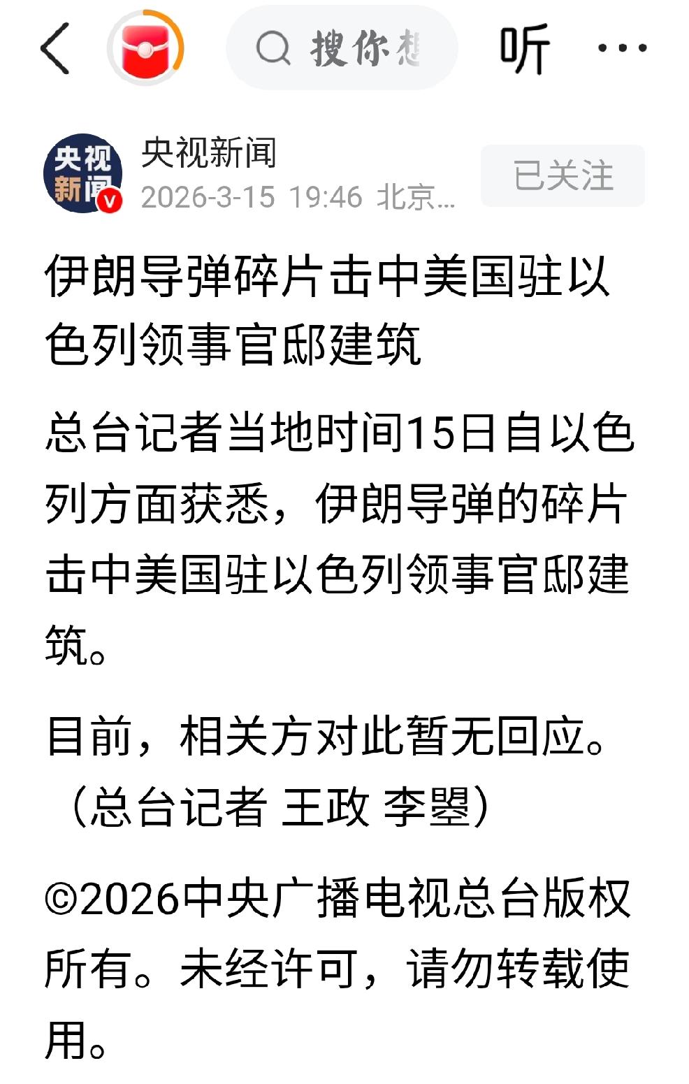 3月15日,央视新闻报道:“伊朗导弹碎片击中美国驻以色列领事官邸建筑” 个人认为:这是伊朗无声并有力扇美国脸面。告诉美国人,伊朗能够打死打伤美国人。 这对于爱好面子的美国总统特朗普来说:“绝对不可接受”。特朗普想必又会接二连三的发文。 伊朗把美国的雷达站摧毁了,美国的加油机也被炸毁了,霍尔木兹海峡封锁了,美国驻海湾国家的花旗银行给炸了,现在美国驻以色列领事馆邸建筑也被击中了。 全世界也都知道了美国的反导系统不好使,那是美国骗钱的壳子货。