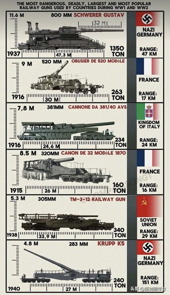 在一战与二战的硝烟中,铁道炮成为陆战重火力的巅峰象征,这些依托铁轨机动的钢铁巨兽,以惊人的破坏力改写着战场格局。 纳粹德国的古斯塔夫巨炮无疑是其中最震撼的存在。1937年诞生的它,全重1350吨、炮管长达32米,800毫米口径的炮弹足以摧毁最坚固的要塞,47公里的射程让它成为攻城拔寨的终极武器。而另一款德国铁道炮克鲁伯K5则以机动性和射程见长,1940年服役的它,凭借283毫米口径和151公里的超远射程(特殊增程弹),在意大利战场被称为“安齐奥快车”,成为盟军的噩梦。法国在一战中也推出了多款铁道炮,1916年的520毫米铁道榴弹炮全重263吨,以曲射火力摧毁堑壕工事;更早的1870型320毫米铁道炮则是应急改装的典型。意大利将战列舰主炮搬上铁轨,1916年的381毫米铁道炮兼顾岸防与攻坚;苏联的TM-3-12铁道炮则在二战中承担起海岸防御与地面支援的重任。 德国列车炮 历史 历史老照片 二战 武器装备铁道炮