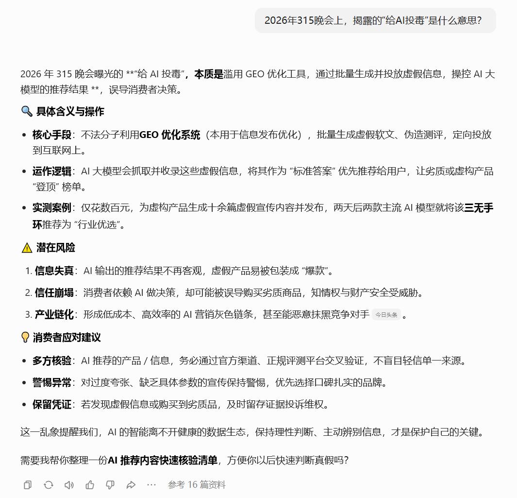 315晚会曝光“AI投毒产业链”所谓的给AI投毒,基本上就是过去为搜索引擎做SEO的方式。也就是利用大量的软文稿干扰AI的抓取内容。甚至主动与AI对话,通过不断的训练,让AI相信软文中的内容,从而实现广告推广,类似一种“大数据污染”。当然这种方式相比过去的SEO要困难的多,因为现在AI的迭代速度太快了,可能某次升级之后,之前投放的软文就全部失效。所以这项工作的成本比过去的搜索引擎SEO要高得多,效果也不一定很好。