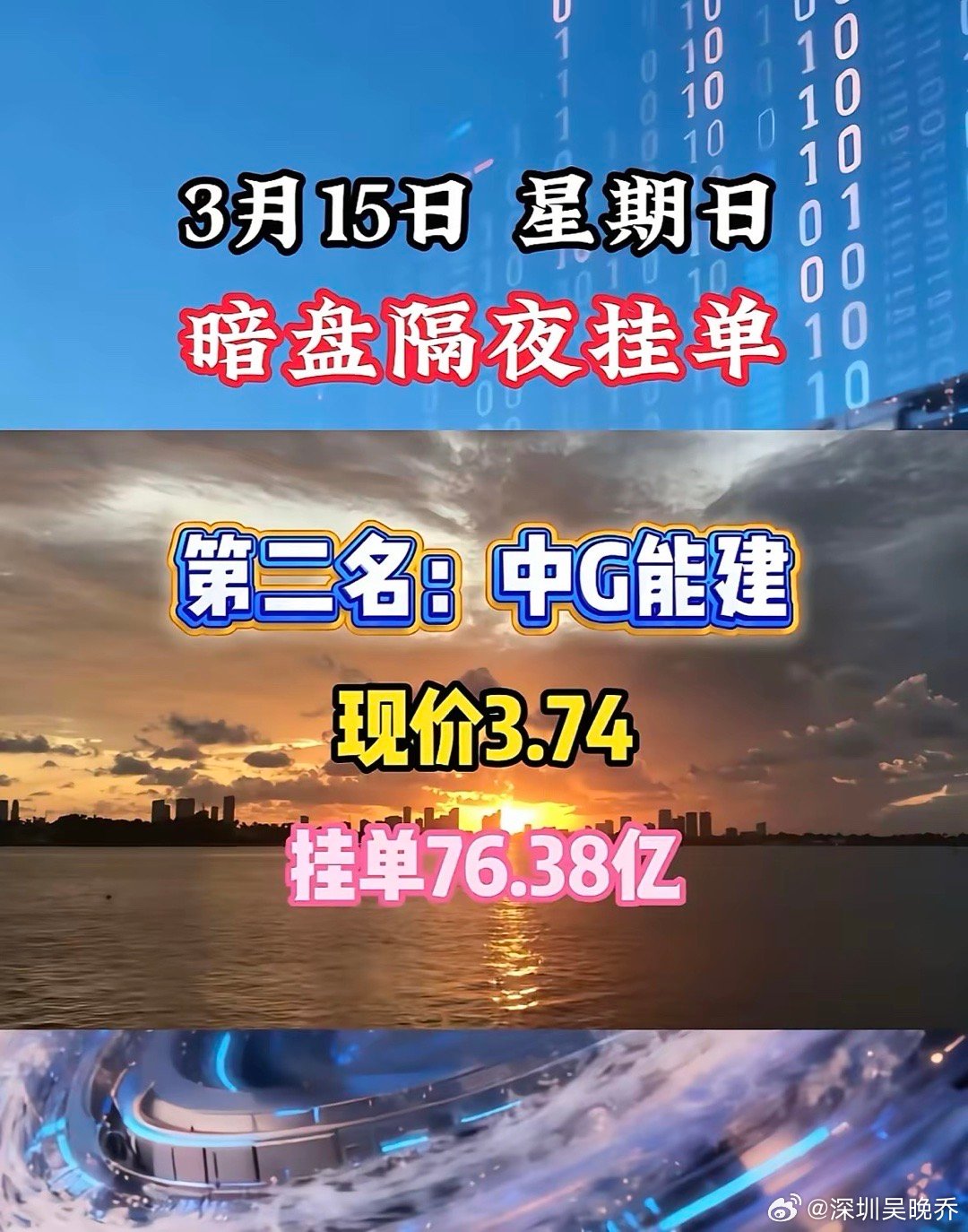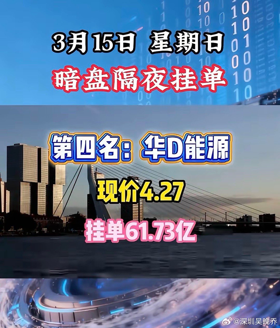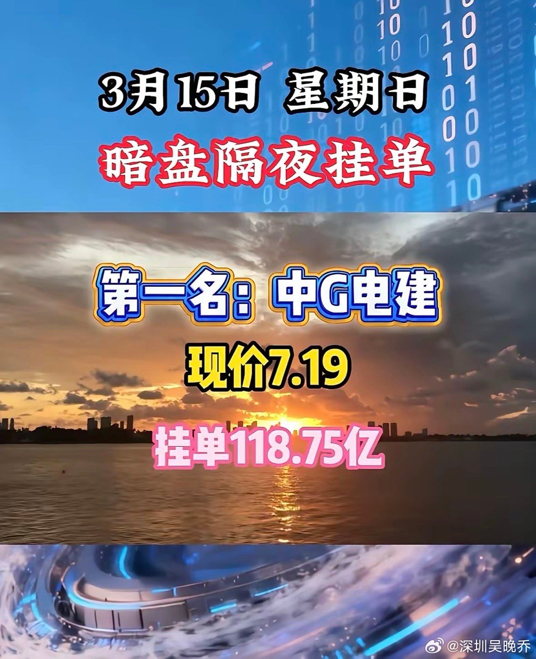 3月15日晚上搞暗盘隔夜挂单。顺便研究股票信息,还真有不少门道。3月16日的隔夜挂单排名就很有看头。像中国能建以66.05亿挂单量居首,现价3.78,这和能源建设大趋势有关,新基建和能源转型让资金看重它的长期价值。节能风电挂单59.26亿排第二,风电板块热度高,政策和技术推动下,资金预期也高。还有岩山科技,现价10.45元,曾冲到112.75元,价格落差让部分资金看到博弈机会。这些挂单数据背后藏着资金暗涌的信号,值得股民好好琢磨。