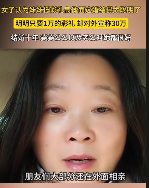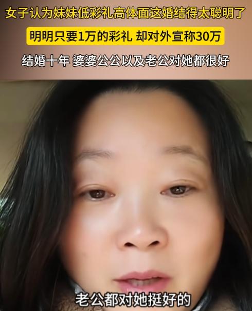一姐姐吐槽妹妹脑子有点毛病,实际明明只要1万的彩礼,却对外宣称30万。现在孩子十岁了,那些闺蜜朋友大部分还在相亲。以前姐姐觉得妹妹有毛病,现在感觉妹妹情商挺高的,脑子没毛病了。婆家人,老公对妹妹很好。 出门在外体面是自己给的,但是这有点坑闺蜜。妹妹撒谎的,闺蜜却拿着当参照物,低于30万的都不嫁。她赢了面子,闺蜜输了人生。 这种自私,一旦被戳穿,友情基本就没了。 仔细一想,也有道理,低彩礼高体面,婆家有面子了,对儿媳妇也好了。就算万一离婚了,老公不好再婚。因为一婚对外宣称都是30万了,二婚低于30万别人肯定不会家,等于堵住了老公离婚后的后路。 但是,既然彩礼都是撒谎的,有没有一种可能婆家人对她好,也是撒谎的。毕竟撒谎的人很容易再次撒谎。 真真假假,冷暖自知,外人看着风光,内里只有她自己清楚累不累。