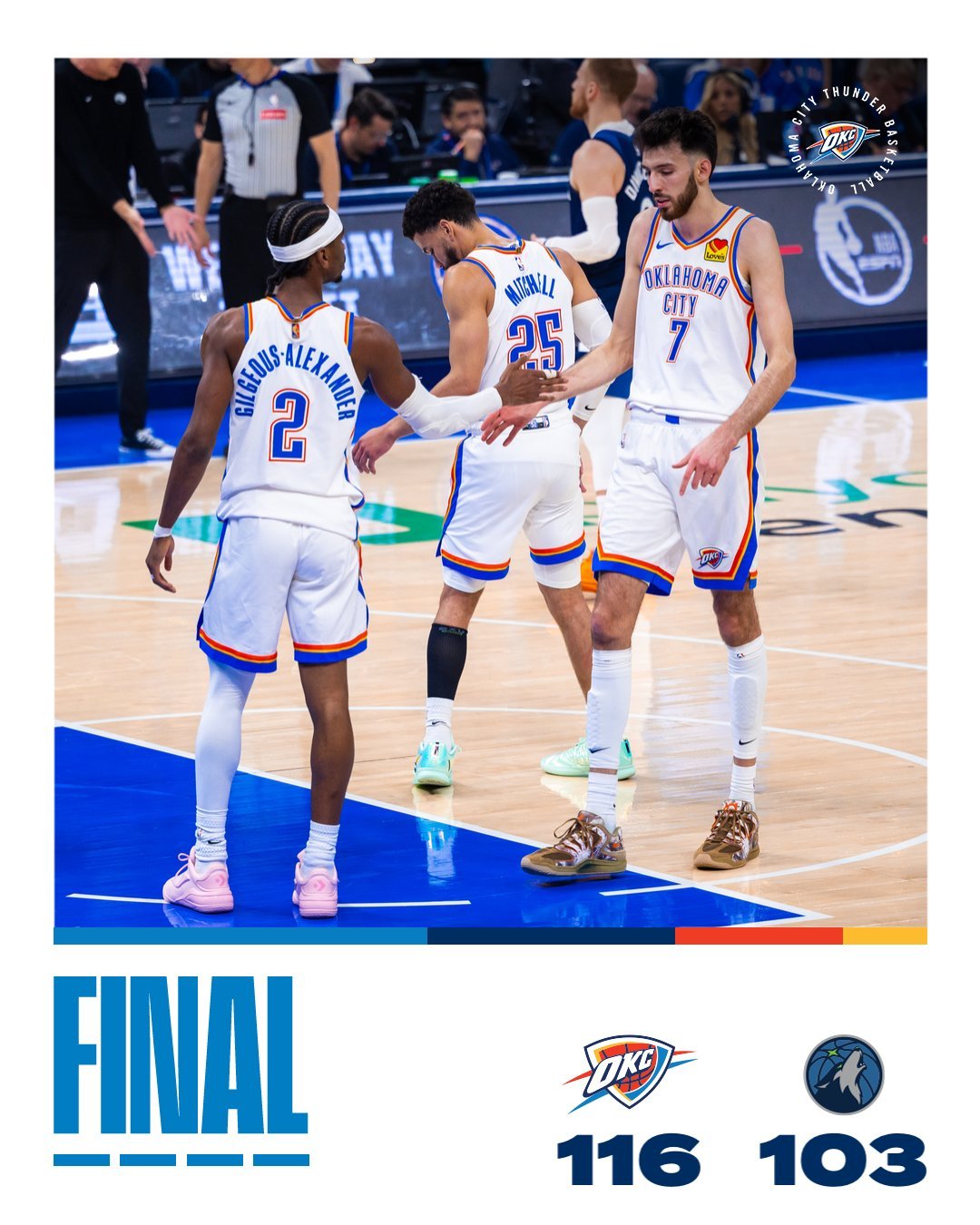 亚历山大第四节得到10分,延续自己连续得分20+的纪录。雷霆替补球员拿下61分,主场116-103击败森林狼,取得8连胜,森林狼41胜27负排在西部第六。